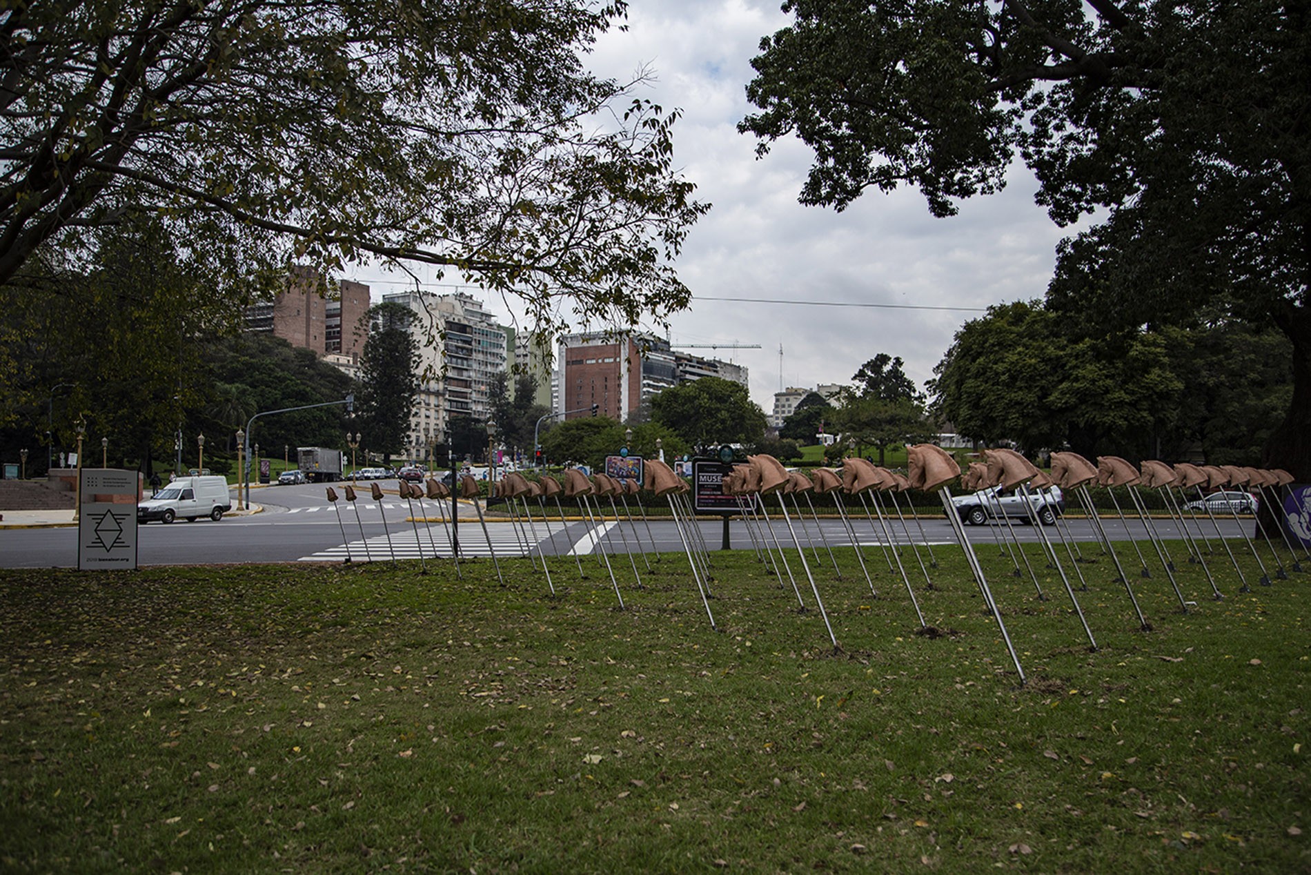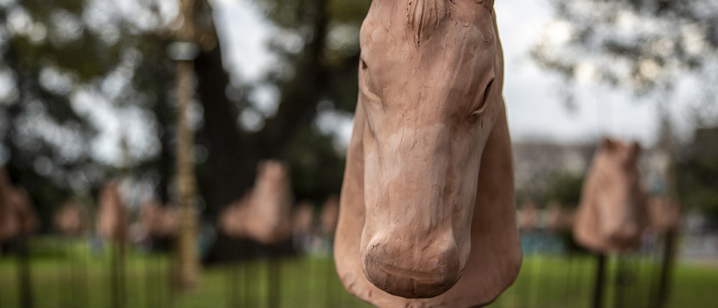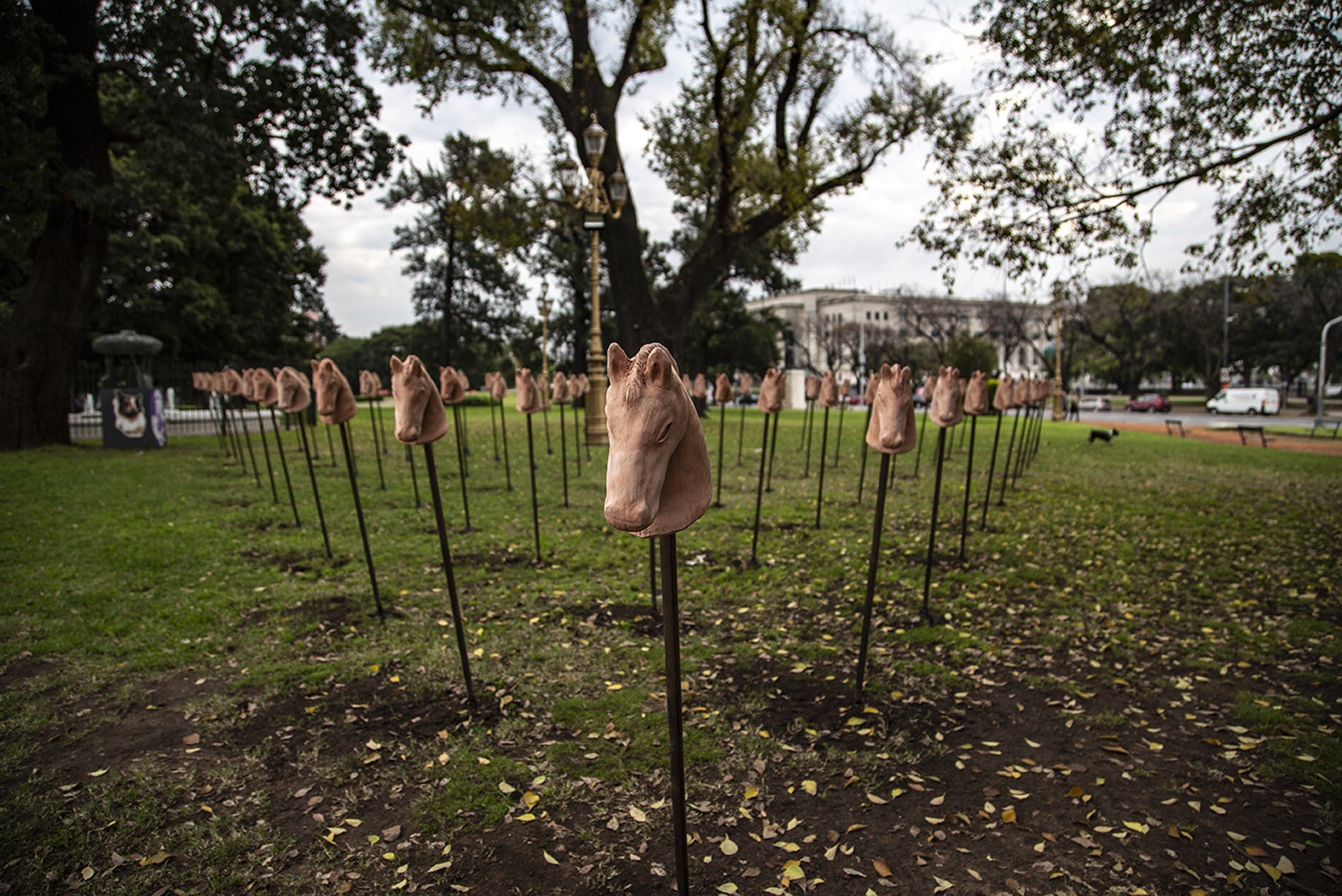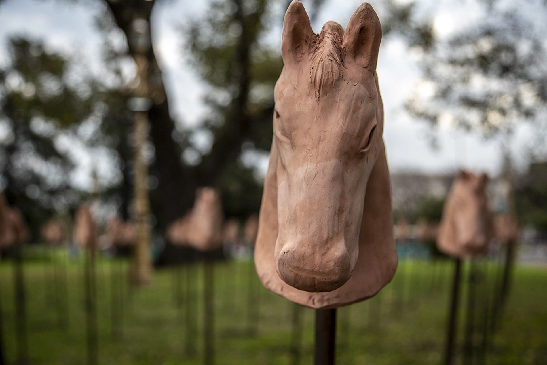 Romero chooses the equestrian monument to Carlos María de Alvear (created by Antoine Bourdelle in 1925) to implant a series of 60 ceramic horse heads on poles in the small triangular space at the foot of the monument. Reminiscent of the hobby horses we used to play with as children, they evoke cowboy films and medieval battles in countless historical narratives.