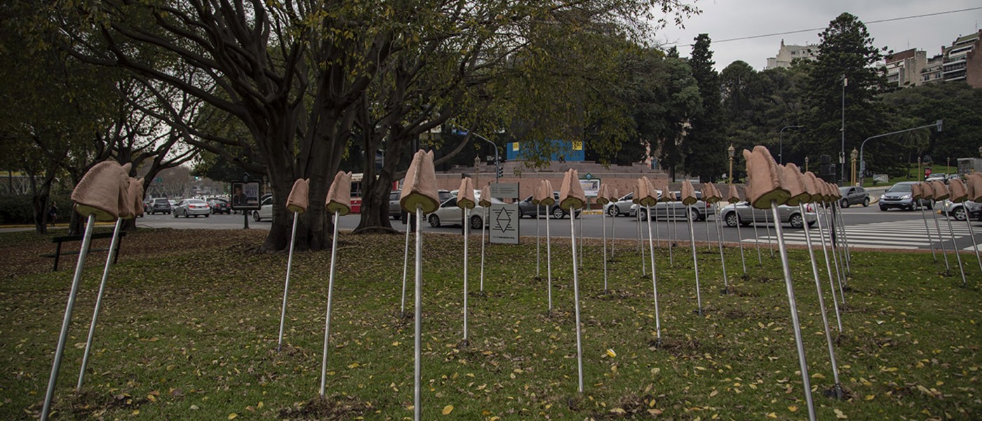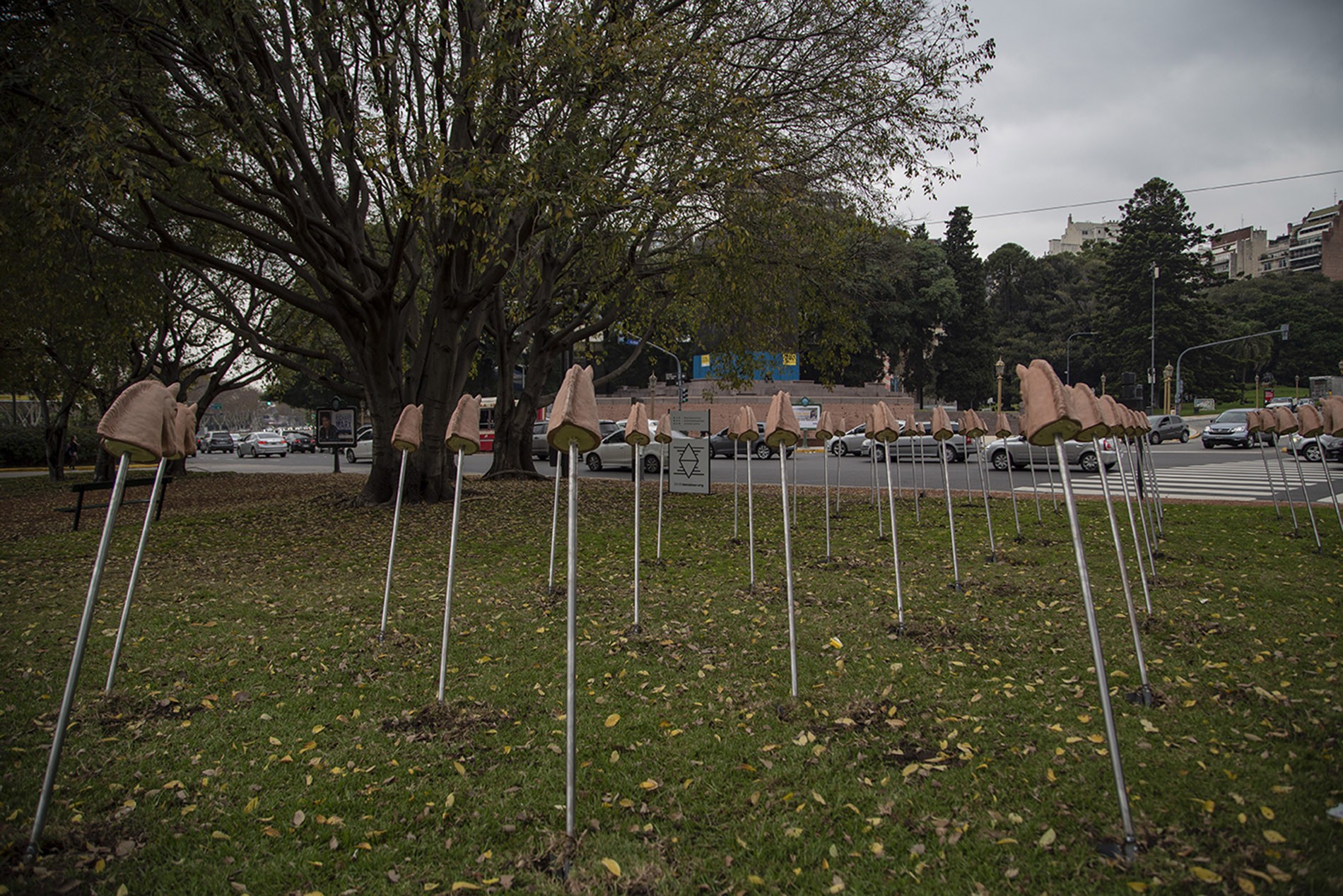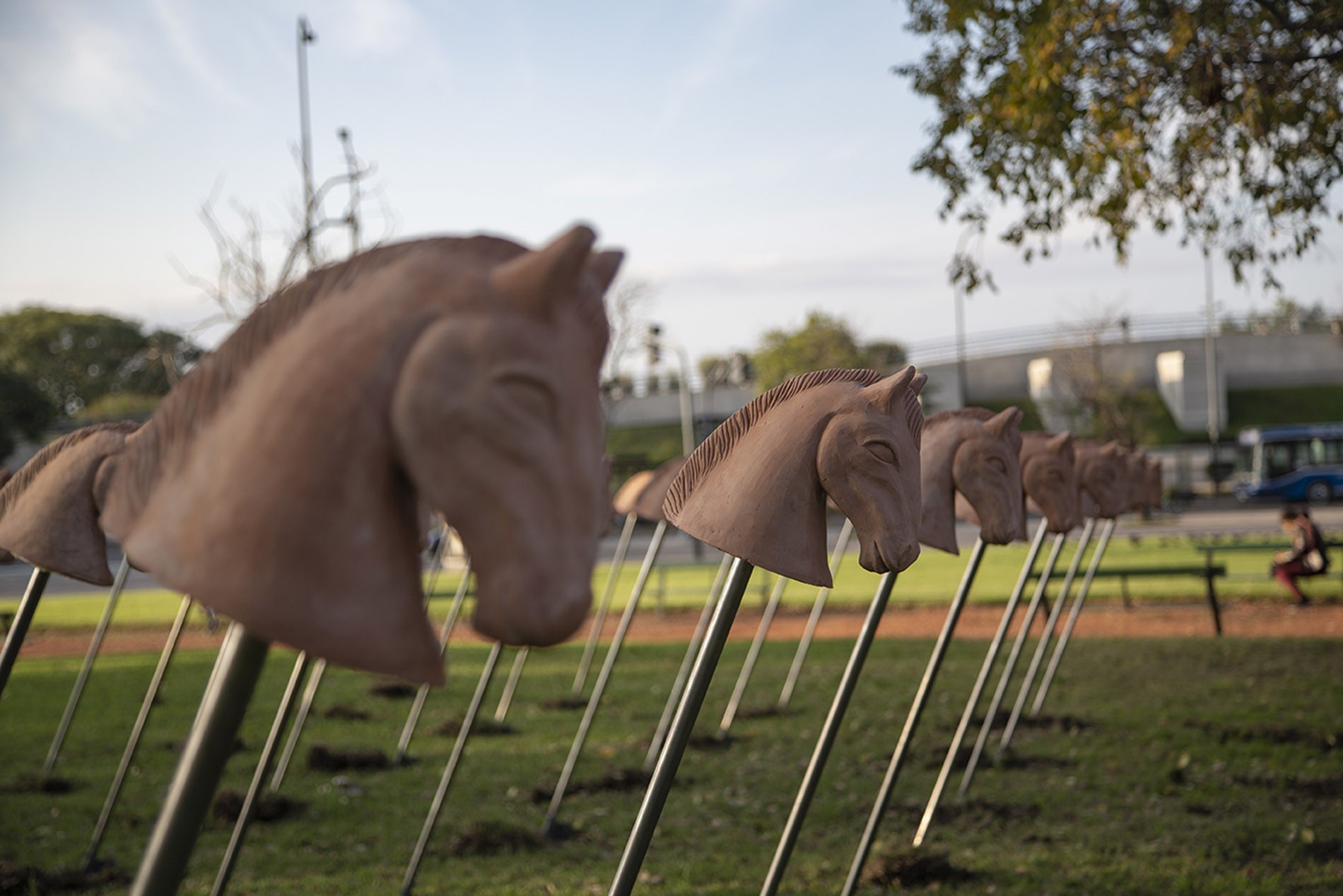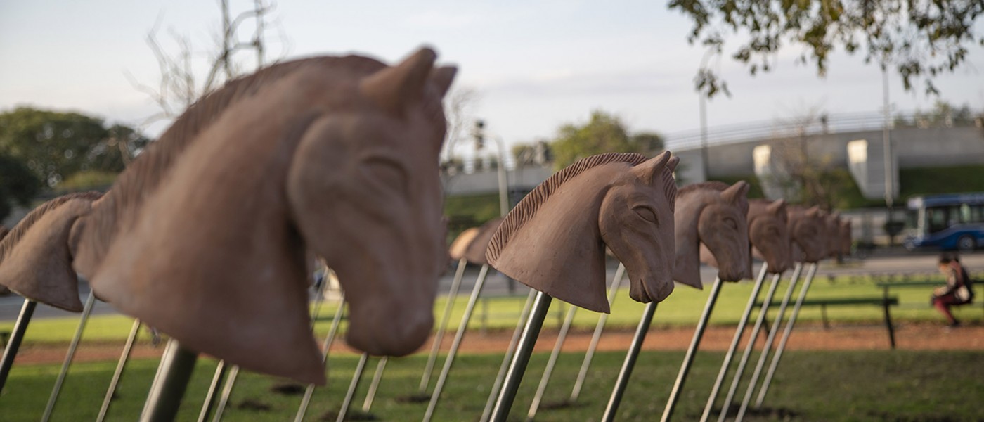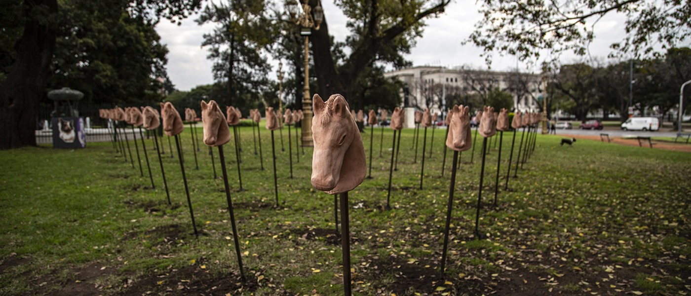 Romero chooses the equestrian monument to Carlos María de Alvear (created by Antoine Bourdelle in 1925) to implant a series of 60 ceramic horse heads on poles in the small triangular space at the foot of the monument. Reminiscent of the hobby horses we used to play with as children, they evoke cowboy films and medieval battles in countless historical narratives.