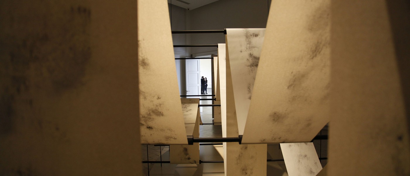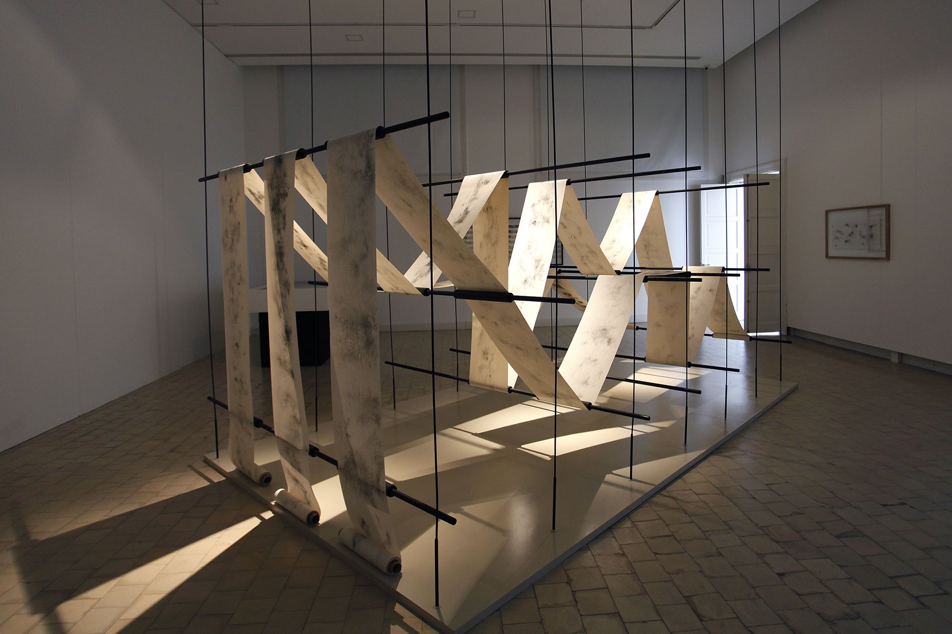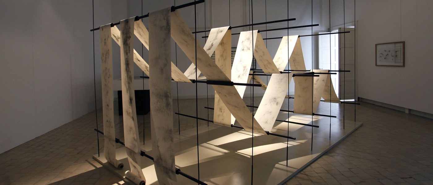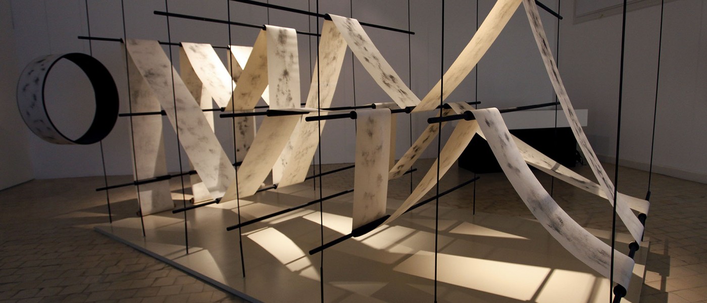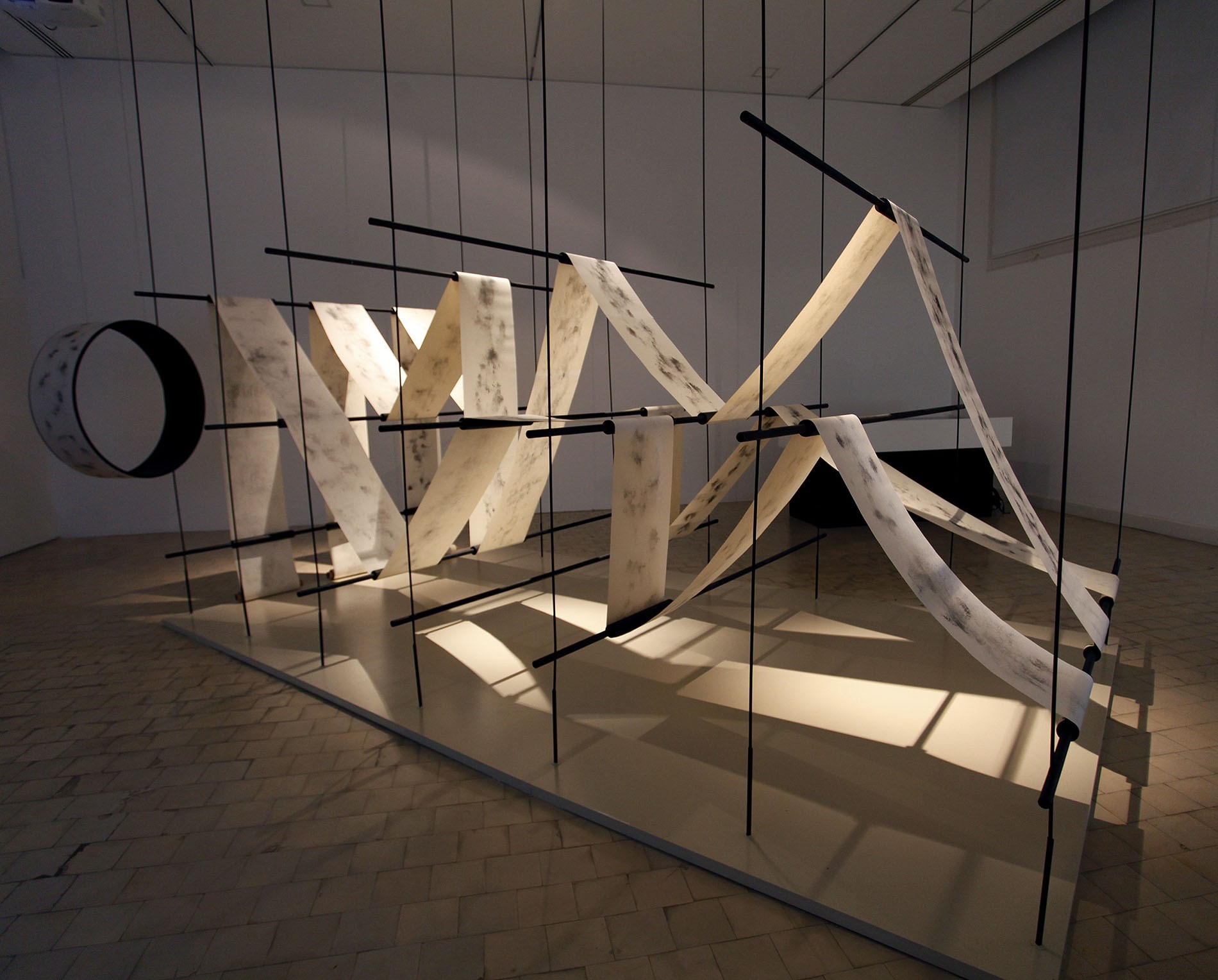 Shono combines words and writing, and in turn, the latter with drawing. It is for this reason, and because of the variety of resources he usually works with, that he chooses for this series charcoal and paper, two materials that are both simple and ductile, to experiment with them not only on the plane but also as volume. This is the origin of The Silent Press, which asserts itself with its still presence, tense and calm at the same time, as if it contained the dynamics of a constant flow of movement. A light metal structure supports the continuous flow of a roll of paper whose writings (texts, drawings?) are illegible and, possibly for this very reason, hypnotically draw our attention. The subtlety of the charcoal marks - random, automatic, accidental - on each of the clear surfaces where the different works that make up this Saudi artist's exhibition are displayed, becomes an enigma that challenges the imagination and, along with it, the possibility of relearning to read in a different manner, discovering codes and clues that lead us away from what we know and open up other paths to understanding and reflection.