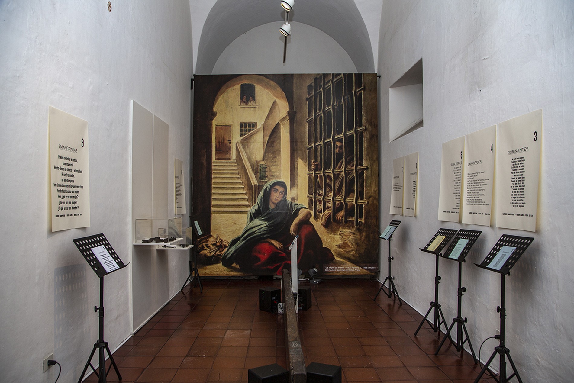 The voices engage in a dialogue that slips through the dungeon bars, floods this historical building, surprises and unsettles visitors, and invites them to search for the origin. In the hall, along with clamps, chains and shackles, some neat lecterns hold the texts uttered