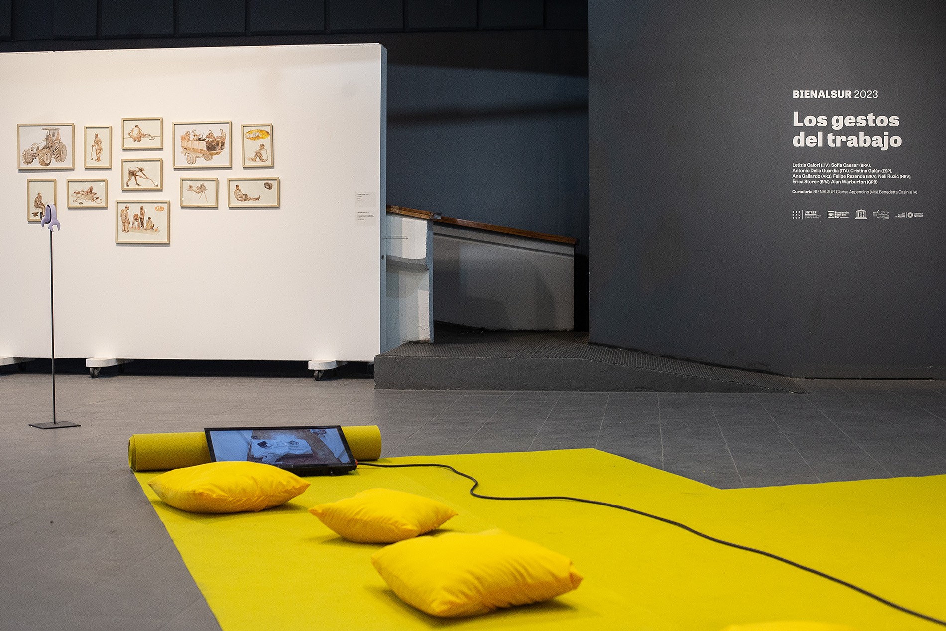 Opening: Friday July 14th 6pm Accounts of societal life and customs, as we know them, rely primarily on the observation of objects, be they cultural products, tools, or utensils. From a knife or a shovel to industrial techniques and automated machinery, our gaze overlooks movements, postures and actions performed upon these objects. Based on gestures, this exhibition focuses on the movements of labour and looks at bodies through the strength of the arms, the posture of the back and the bending of the legs. These works critically examine the relationship between bodies, work and technologies in contemporary societies. They shed light on diverse bonds of work, ranging from the neoliberal bureaucratic overproduction of the financial world to precarious rural and industrial labour. In this regard, the itinerary shows the corporeal dimension in the contemporary work patterns of home office and entrepreneurship – euphemisms that reveal new links and gestures in a context of deregulation of the working day, a feature of post-industrial capitalism. From a historical and political perspective, these works also present gestures without objects. Tools disappear and the emphasis lies on bodily movements that have become obsolete or have been drastically transformed into other forms of work due to industrial and agricultural technification. Alan Warburton and Cristina Galán's projects are permeated by the degradations of a 24/7 society based on permanent connectivity and the relentless production of content. Their impact on contemporary subjectivities can be seen in the bodies presented in the works of both artists. Similarly, Érica Storer, Sofia Caesar and Ana Gallardo focus on the progressive blurring of the boundaries between work and leisure space. Office objects take over unmade beds and deckchairs, and even climb up a concrete wall in defiance of gravity. The diversity of jobs included in Ana Gallardo's CV, barely related to her artistic work, serves as a reminder of the instability and precariousness inherent to labour relations in post-Fordist society. In contrast to these dystopian imaginaries appropriated by the omnipresence of labour, Neli Ružić portrays the nostalgic gestures repeated by Ana, a former Croatian textile factory worker. The Dalmatinka factory in Sinj, one of the main production centres of the former Yugoslavia, closed down in the 1990s to become a venue for receptions and events. Ružić pays homage to work, a fundamental tool of women's emancipation in socialist regimes, whose dissolution in the context of liberal democracy is evident in the traditionalist regression of gender mandates. On the other hand, in the works of Letizia Calori, Felipe Rezende and Antonio Della Guardia the tools and gestures of work are softened, stripped of the roughness and rigidity traditionally associated with manliness and productive efficiency. They become versatile objects and actions whose humorous anomalies bear a subversive potential. Clarisa Appendino and Benedetta Casini