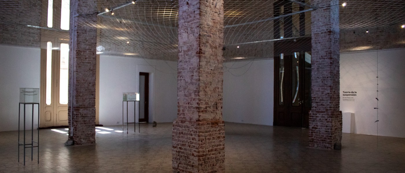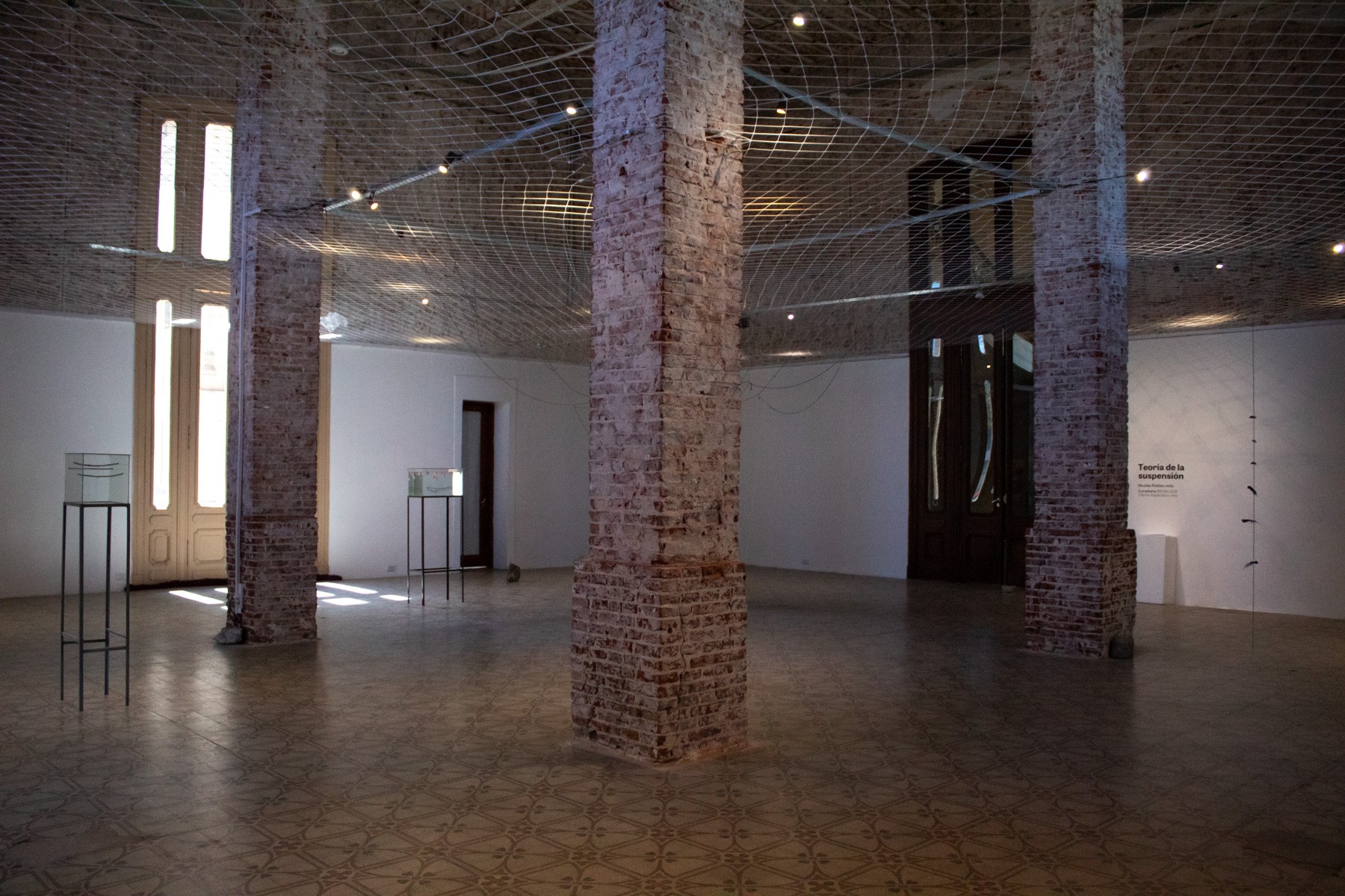 This exhibition encompasses a series of investigations that the artist has undertaken into the tensions between materials, their counterweights and the capacity of a line to hold, sustain and withstand the weight of objects. Theory of Suspension involves a twofold procedure: the possibility of marking in space the force that keeps us glued to the ground and the opportunity to imagine a state of exception, of suspension of such a force, as a way of signalling it from its opposite. Whereas in this scheme architecture is shown as a seemingly empty container, the net puts space in suspense.