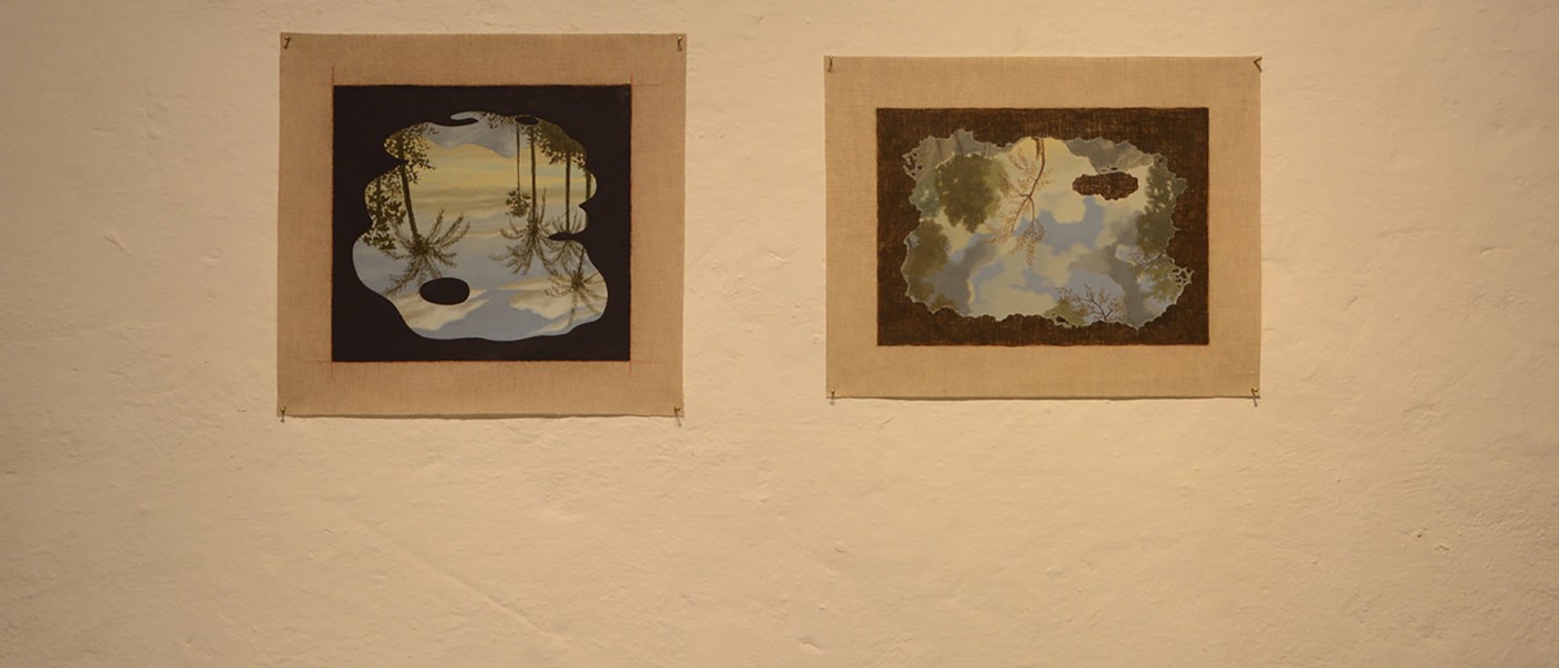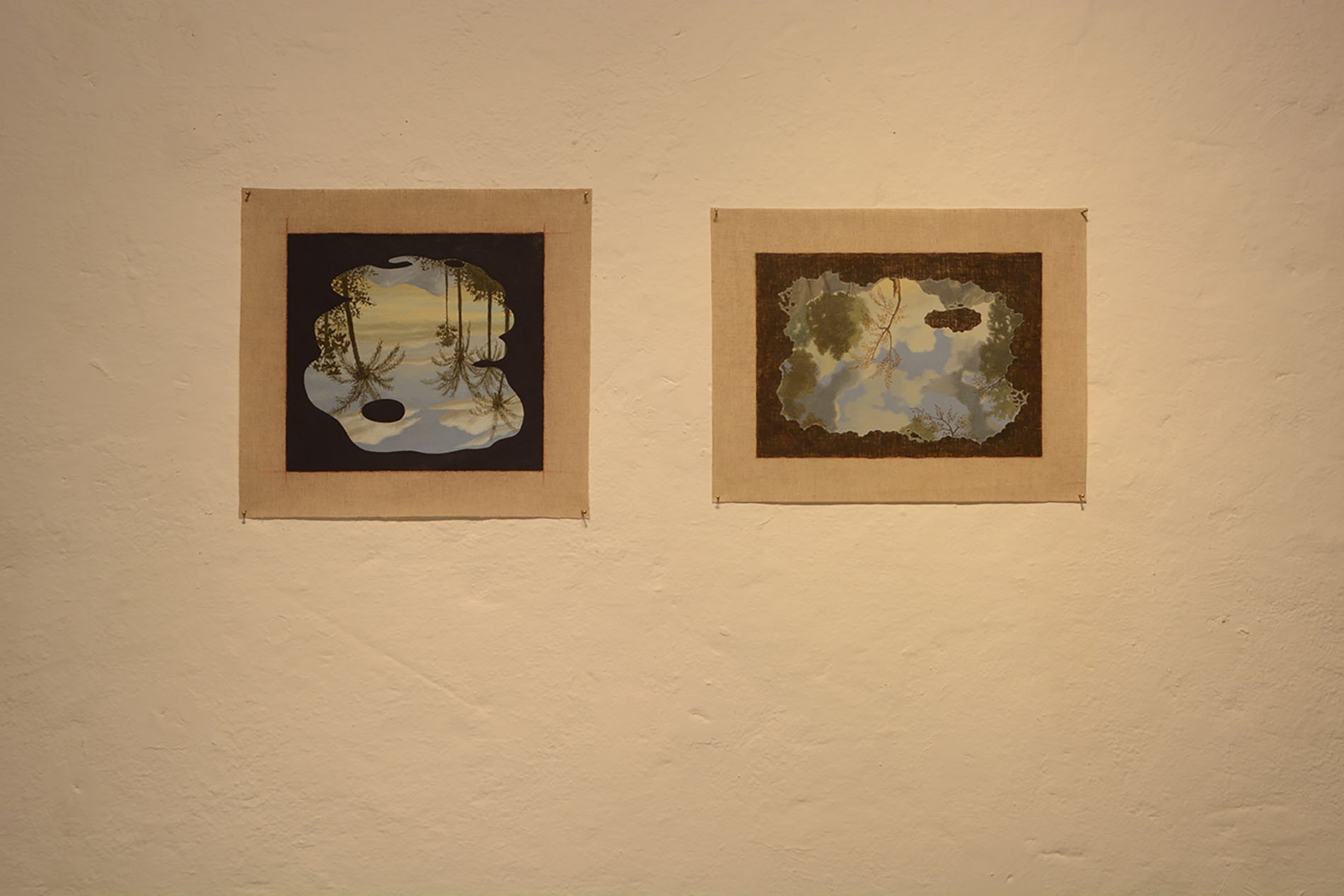 What occurs when one looks at a puddle and finds the same elements of the landscape reflected without any order, challenging the long-established use of perspective as a resource by which humans organize and consume? It is akin to an intimate scale of the landscape; the objects remain the same but are arranged differently and presented in an intimate way. Hence the idea of creating small paintings, capturing the minimum scale of the vast pool within the aquifer of the Paraná basin, gradually diminishing in size in the marshes until it manifests in the puddles encountered during a stroll.
