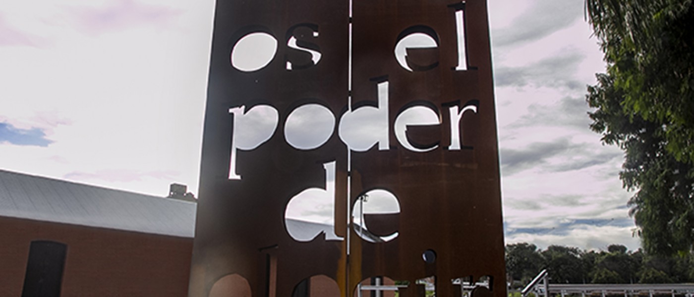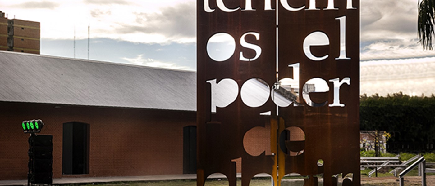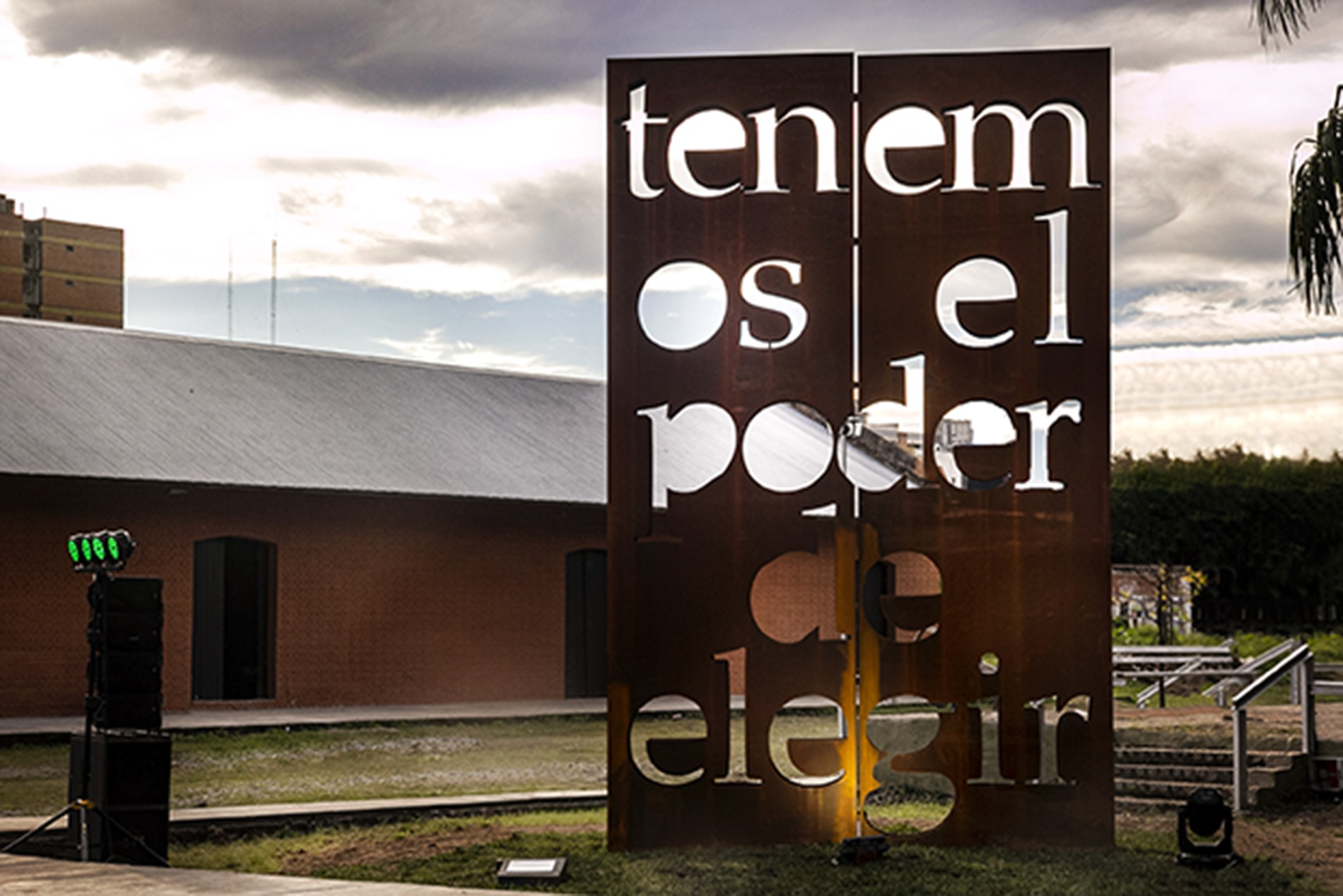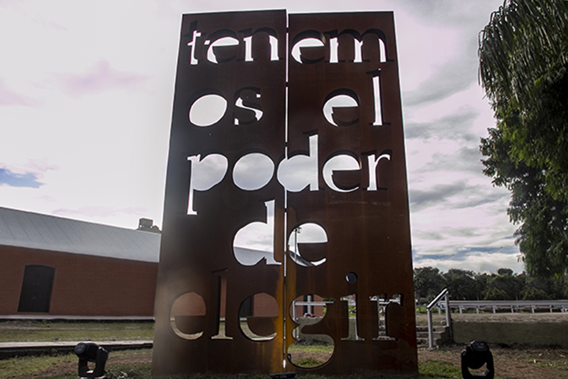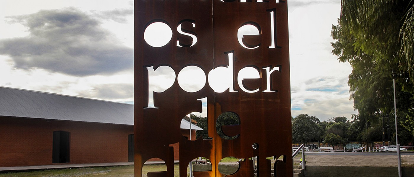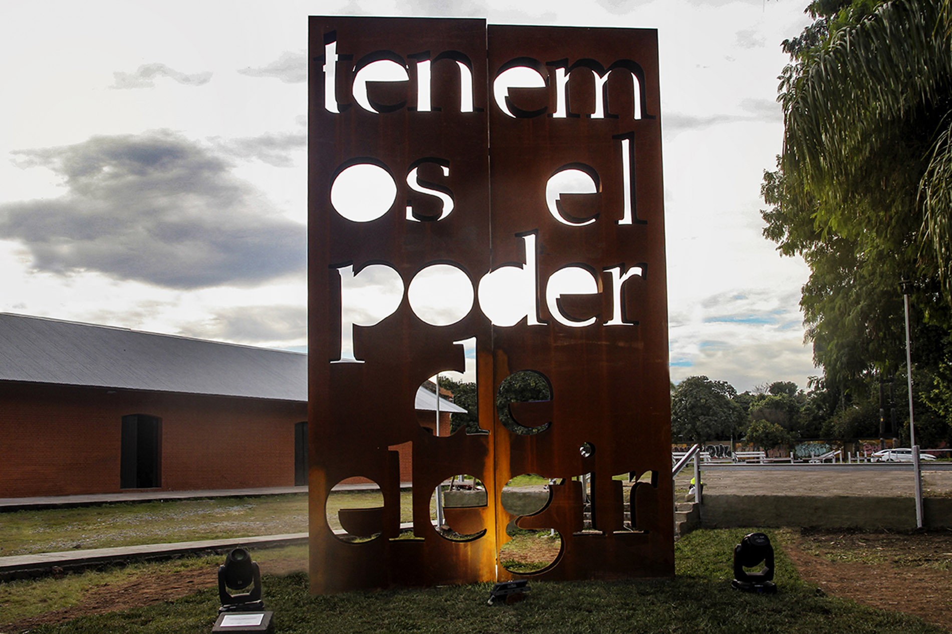 We have the power to choose, reads the emphatic statement by Marie Orensanz, inscribed on an iron plaque. A simple typeface in lower case is a clear indication of the intention to elude any authority and blend into the urban landscape. Orenzanz has chosen this form of conceptual proposal to attract people’s attention: whether with her Thinking is a revolutionary deed in the Buenos Aires Park of Memory, or when she places us Beyond time with her thicket of statuesque clock-hands, harking back to clocks from different times and places. Here in Tucuman, what is laid bare is one’s ability to choose. Her works invite us to take a pause, to interact with the dull metal sheets and reconstruct her idea, one she has posed before us with the certainty that whoever walks past her work will continue on their way with her words echoing in their mind. Artistas: Marie Orensanz (ARG/FRA)
