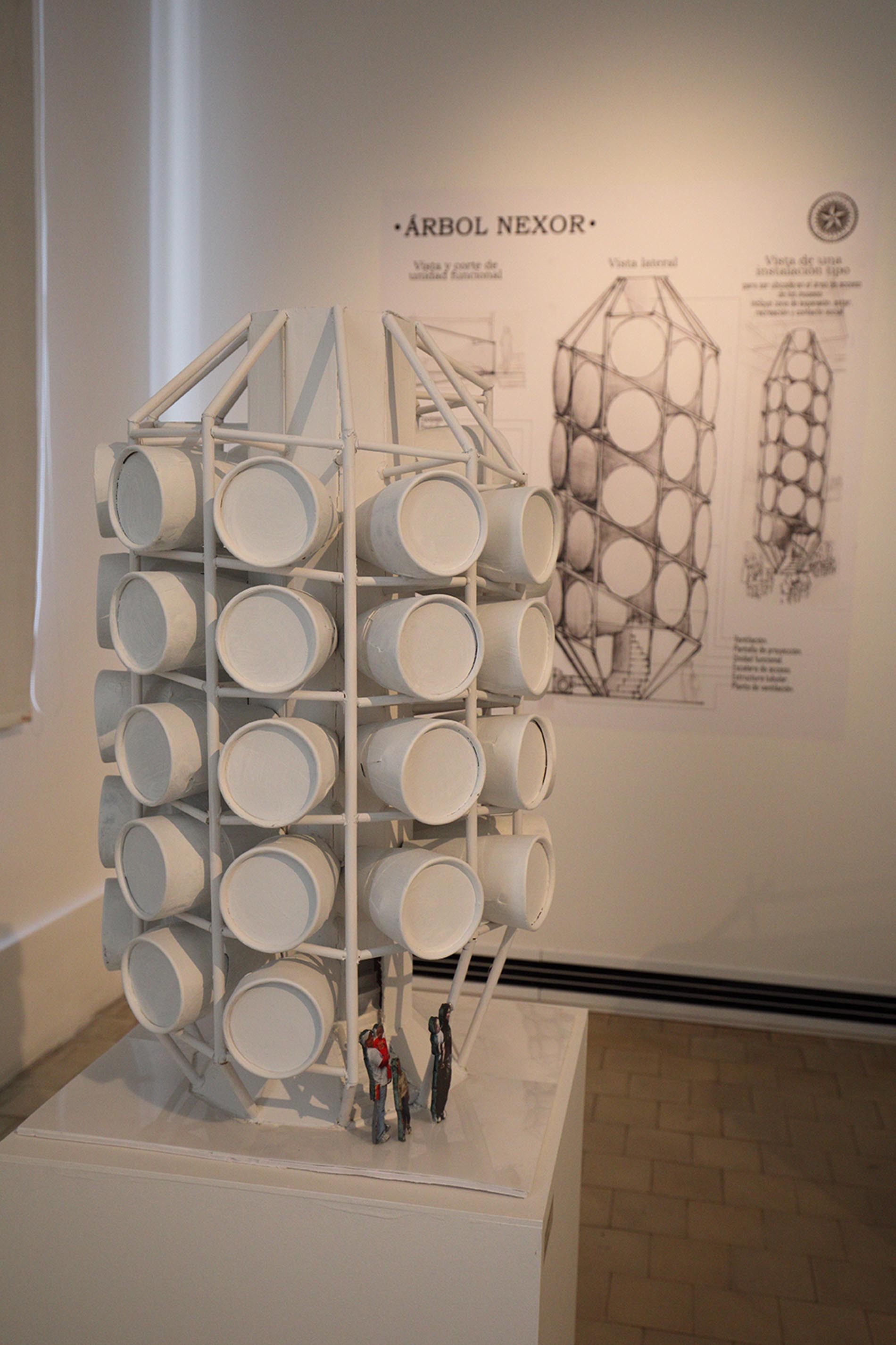 La instalación Árbol Nexor es la continuidad de La Ballena va llena, obra fundamental de este colectivo de artistas argentinos. En La Ballena va llena, el colectivo Estrella del Oriente (EDO) plantea la solución del problema migratorio hacia los países del Primer Mundo. Dado al carácter restrictivo de sus leyes, el colectivo encontró una solución: en vez de aplicar las leyes migratorias, hay que aplicar las leyes del arte, que permiten la libre circulación y protección de obras. EDO propone que mediante un viaje en el barco Ballena, los migrantes se transformen en obras de arte, aplicando la ley duchampiana -admitida en el mundo del arte- de ampliación de obra a los objetos cotidianos. Siendo obra de arte certificada y legitimada por EDO, el migrante debe ser admitido y protegido por la ley de esos países. De no hacerlo, esos estados vulnerarían sus propias leyes. Una vez llegados al país elegido, se plantea un nuevo problema. ¿Dónde alojar a los migrantes? El Árbol Nexor es la continuidad de La Ballena para abordar esta nueva situación. El colectivo planifica un sistema de viviendas, el Árbol Nexor, en forma troncal rizomática, donde los migrantes-obra de arte podrán contactarse con el público en el hall de los museos, lugar de bienvenida y protección. Mostrarán sus historias y costumbres a través de los dispositivos especiales del Árbol. Habilitará así a los migrantes-obra de arte a recuperar su forma humana primordial: la de habitantes, al ser comprendidos y admitidos fraternalmente, sin mediaciones, por la sociedad a la que han llegado.