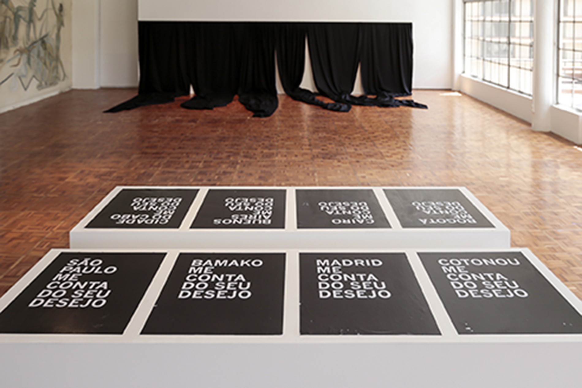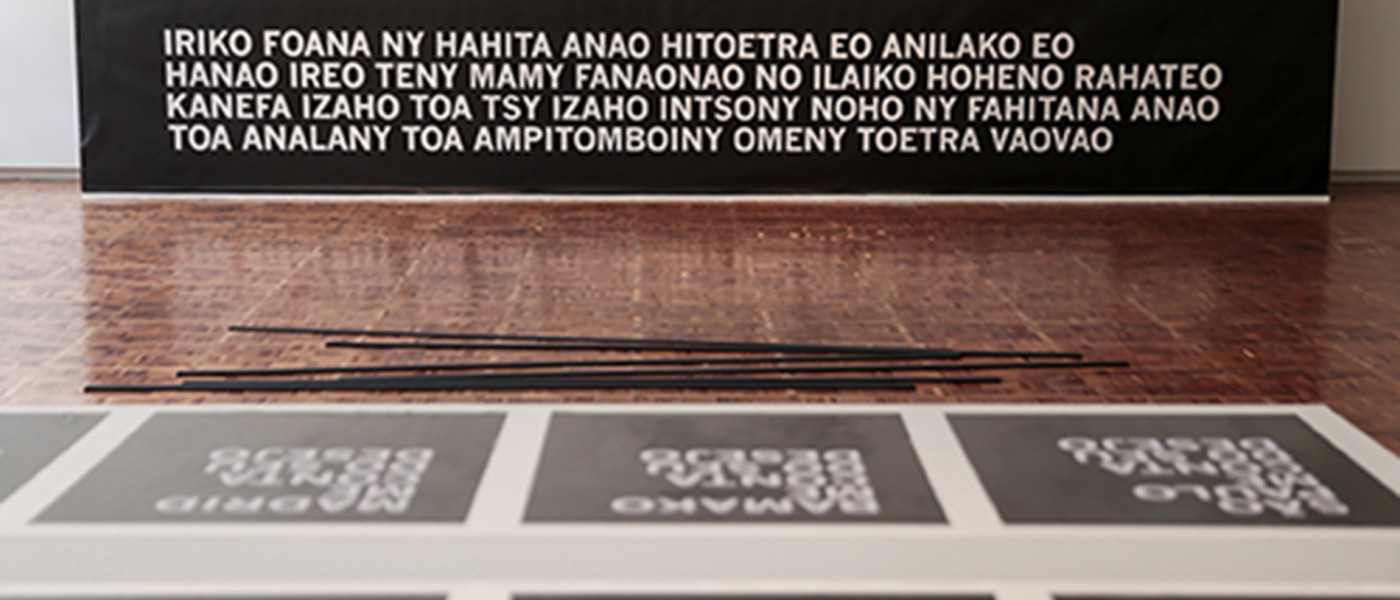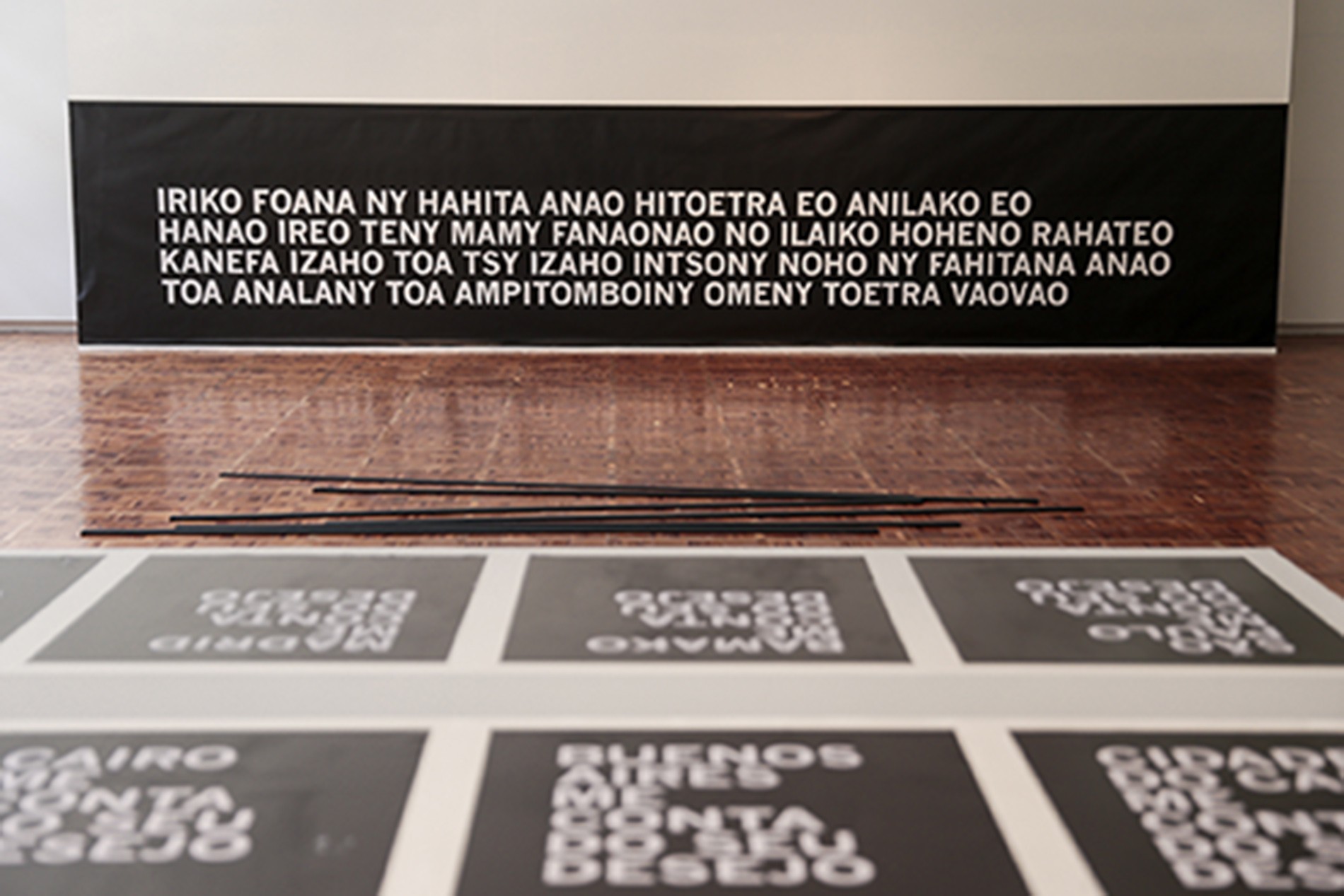 La palabra es una de las piezas del juego que se organiza en torno a una idea fuerza en la que el sitio manda. Así, Joël Andrianomearisoa visita las calles de los sitios que se le invitó a intervenir en el marco del Territorio BIENALSUR: que van desde las calles de Buenos Aires hasta el MUNTREF sede Hotel de Inmigrantes en Argentina, y los espacios urbanos del campus de la Universidad Federal de Río Grande do Sul en Porto Alegre en Brasil, además de las calles de Cotonú y Ouidah en Benín. Un conjunto de textos en sencilla tipografía blanca sobre plano negro se ofrecen como un enigma a resolver; confundiéndose primero, quizás, con publicidad para luego cobrar otros sentidos. Se identificarán las lenguas allí yuxtapuestas, se comprenderá de a tramos, emergerá el extrañamiento. Este proceso, muy ligado al del viaje y la migración -dónde sino en la lengua y sus usos se radica uno de los nodos de la distancia cultural- invitan a repensar sobre las condiciones de vida que tenemos naturalizadas. Más aún, a uno y otro lado del Atlántico, esta revisión retoma también la memoria de esos viajes forzados por el comercio de esclavos tanto como por los exilios y las migraciones forzosas.