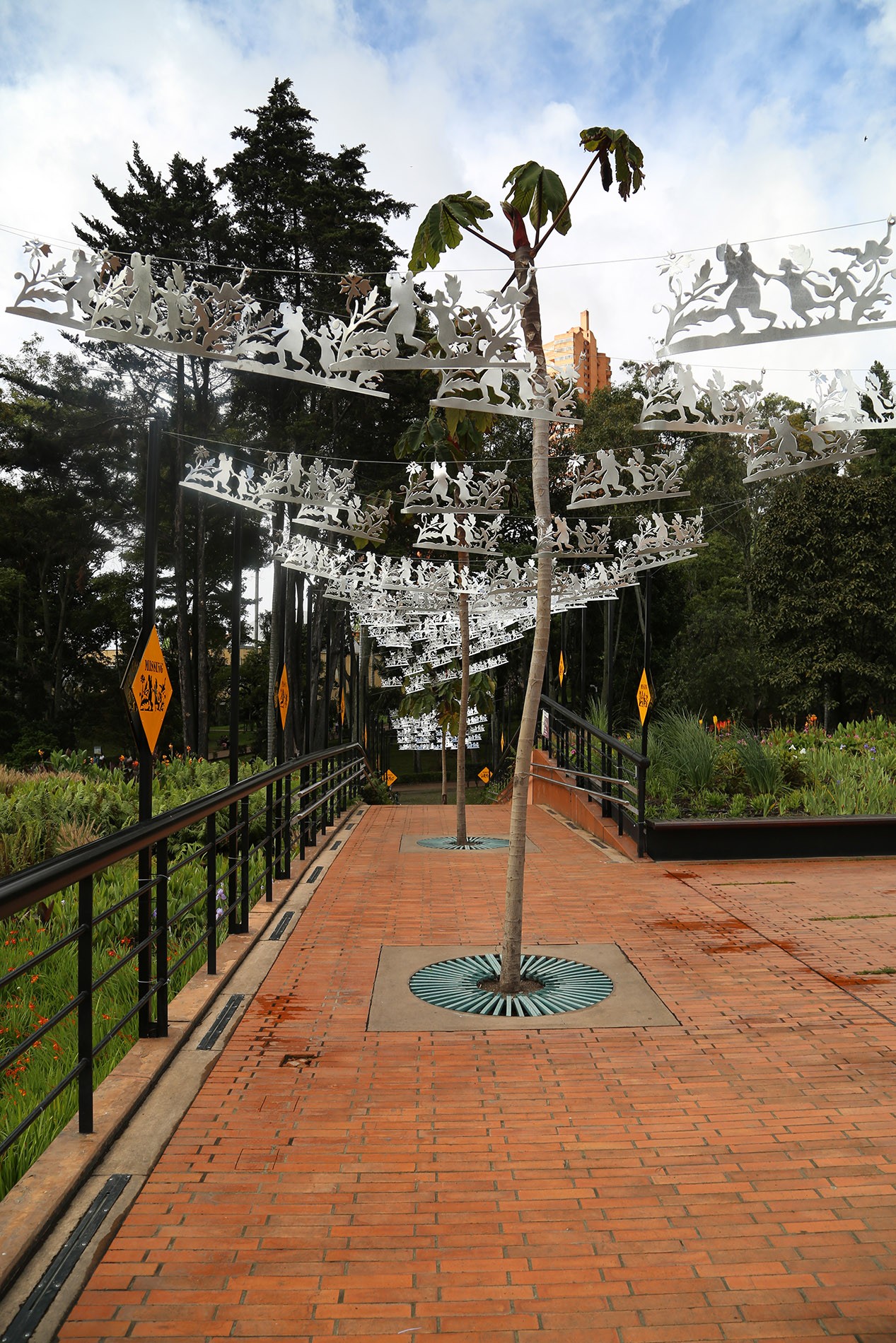 La artista ofrece un trazo aéreo para la escritura y la lectura de figuras que ocupan el espacio en forma serpentina para aludir a la fragilidad y el peligro en que las familias de migrantes se encuentran durante sus travesías. La composición remite a la estructura de las guirnaldas de papel picado que se instalan en líneas paralelas en el espacio urbano durante las celebraciones populares de distintas comunidades.