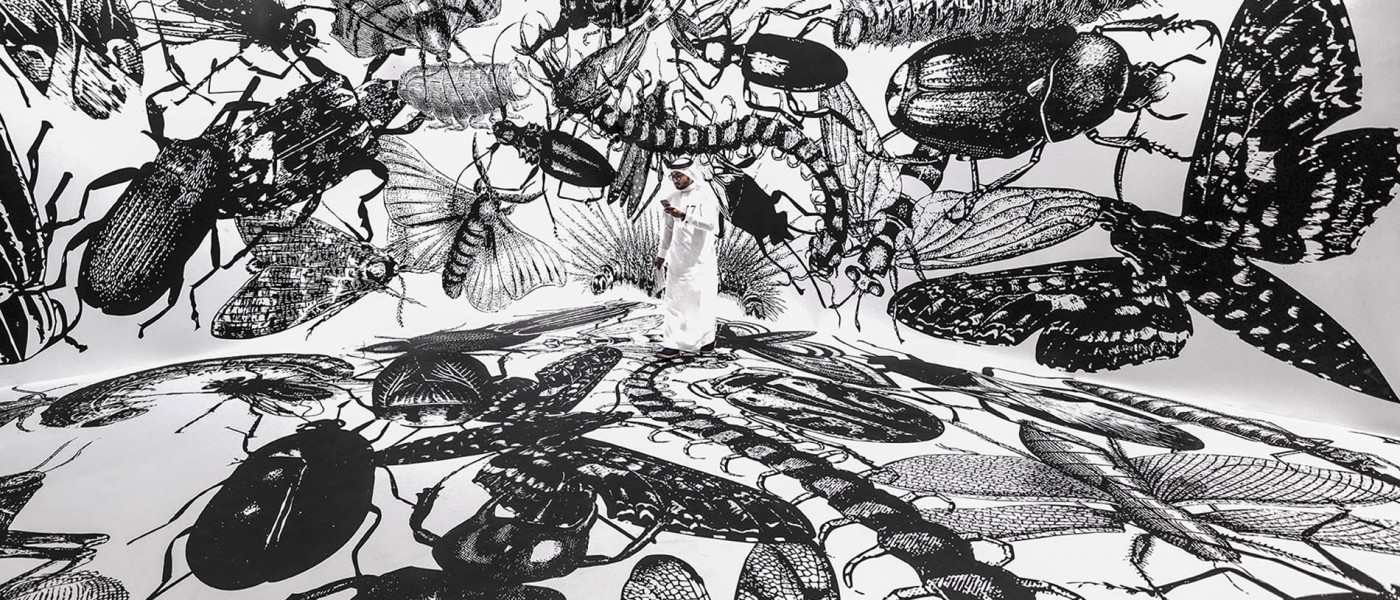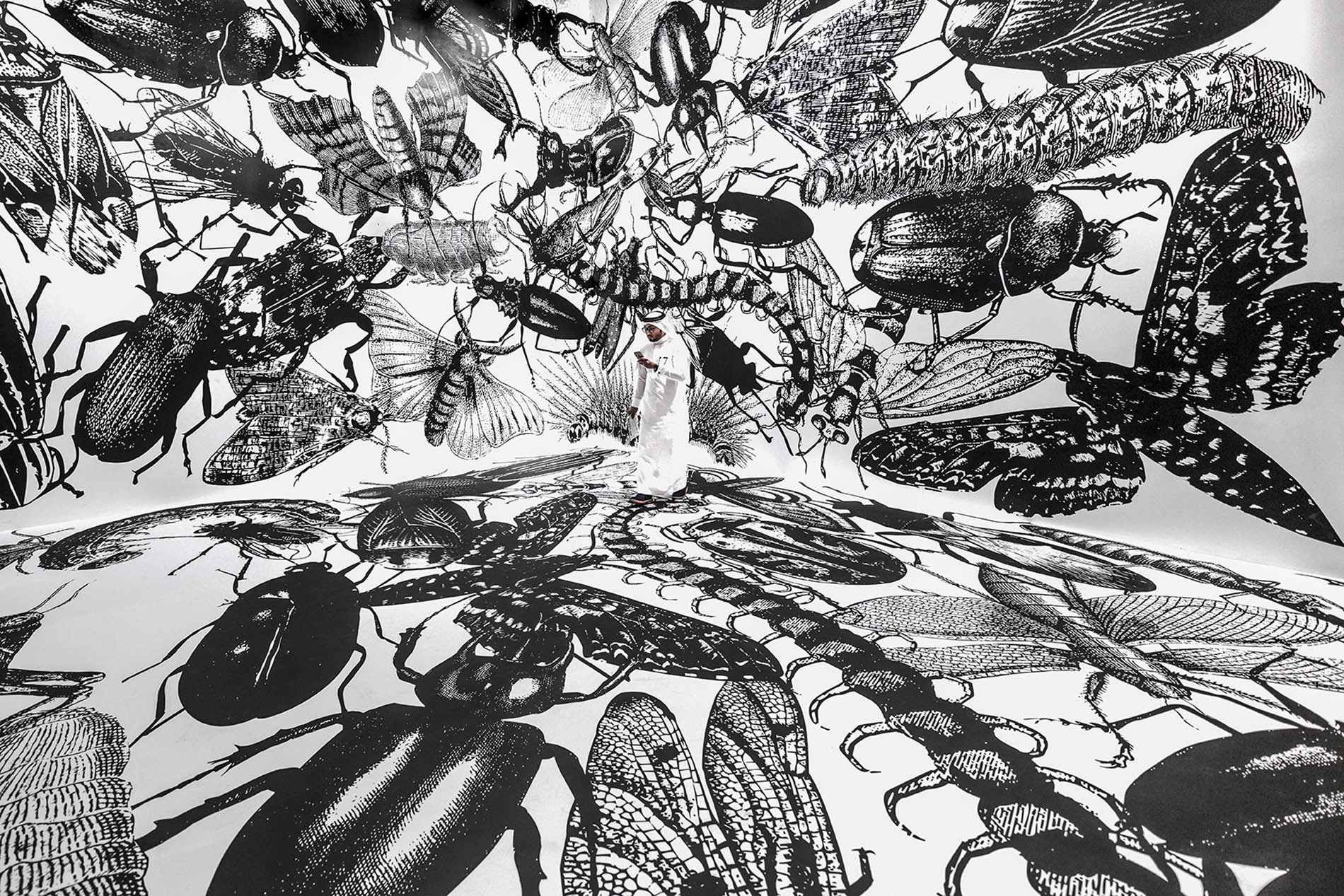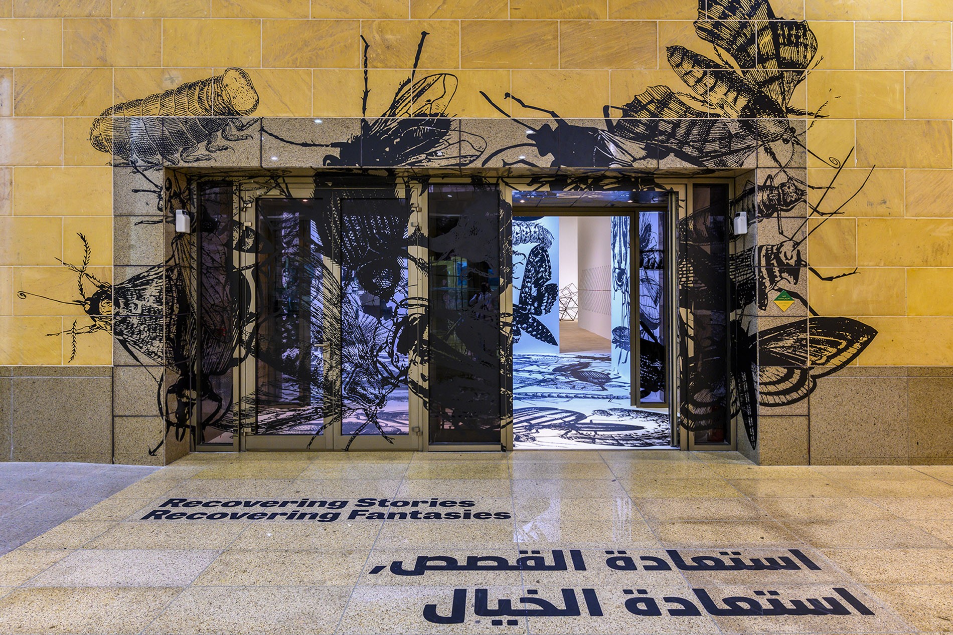 El público entra en la sala a través de la obra de Regina Silveira y se sumerge en un espacio lleno de imágenes de insectos gigantescos impresas en las puertas, las paredes y el techo. Más allá de esta inesperada entrada, es posible acceder a otro microespacio y encontrar en la pieza de Eduardo Basualdo el universo acuoso de las sirenas, o en otra habitación contemplar la mágica instalación floral del artista japonés Makoto Azuma y la peculiar historia contada por Laurent Grasso. Además, los espectadores pueden sorprenderse con algunos dibujos espaciales y una instalación de José Bechara y Marco Maggi, o sentirse perdidos en el espacio con la videoinstalación de Graciela Sacco o la pieza textil de Paola Monzillo realizada con mapas. A continuación, los espectadores podrán conocer la experiencia del tiempo de Ayman Zedani, la identificación de las esperanzas de Faisal Samra, y asistir a las singulares narraciones de Sarah Abu Abdallah. Finalmente, llegan a la última sección del espacio para encontrar el mundo íntimo de Fátima Al-Banawi y el imaginativo trabajo de Mariana Telleria, una embarcación gigante que parece haber quedado atrapada allí.