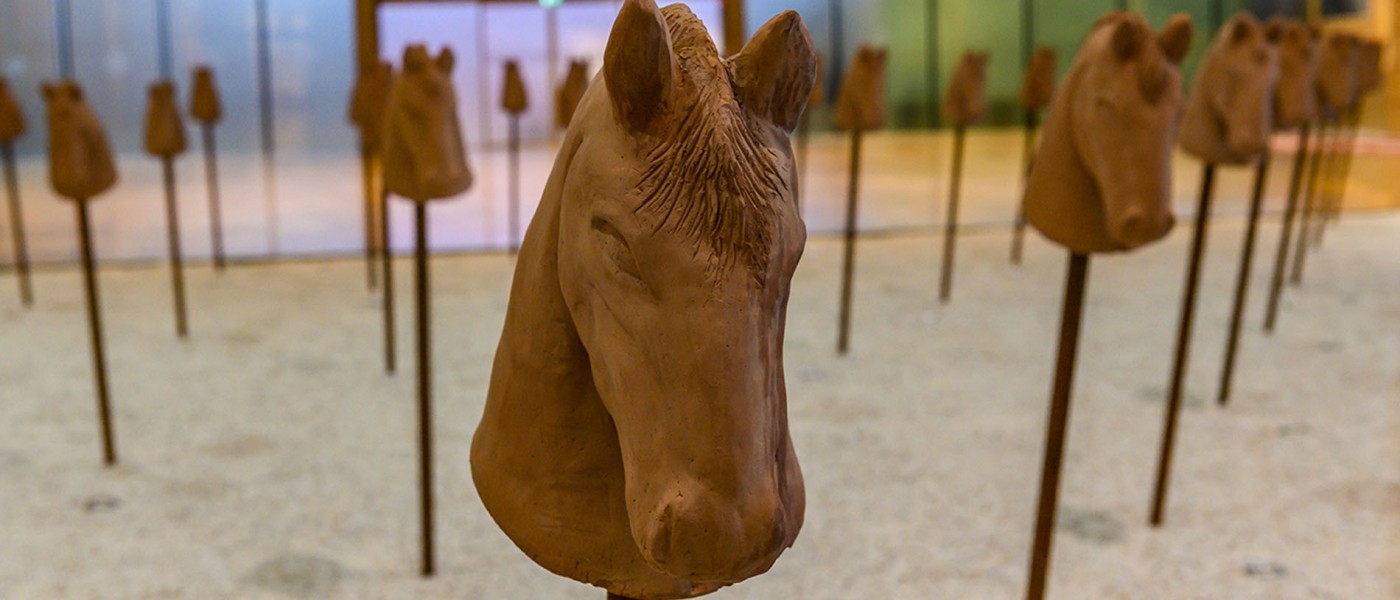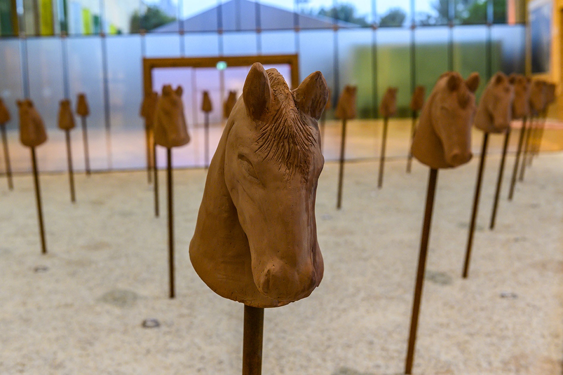 La instalación de Betsabeé Romero evoca películas de vaqueros y batallas medievales en innumerables narraciones históricas, que recuerdan a los caballos con los que jugábamos cuando éramos niños. La simplicidad de la obra es una invitación abierta a repensar estas narrativas desde otro punto de vista.