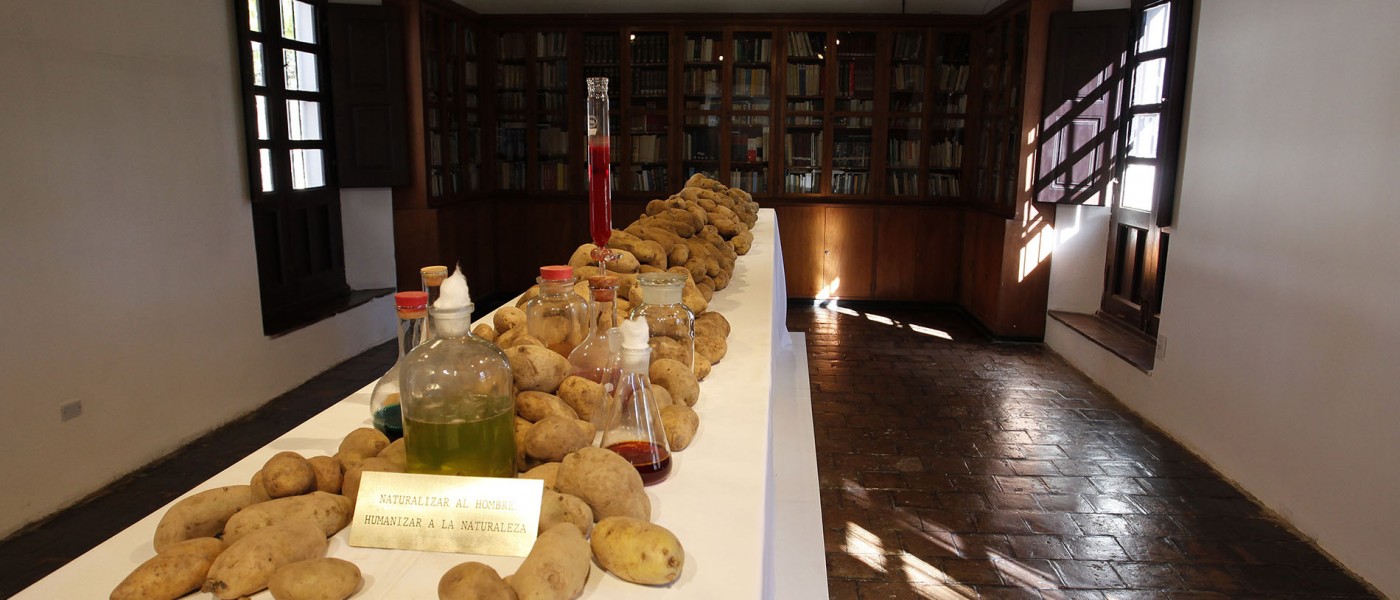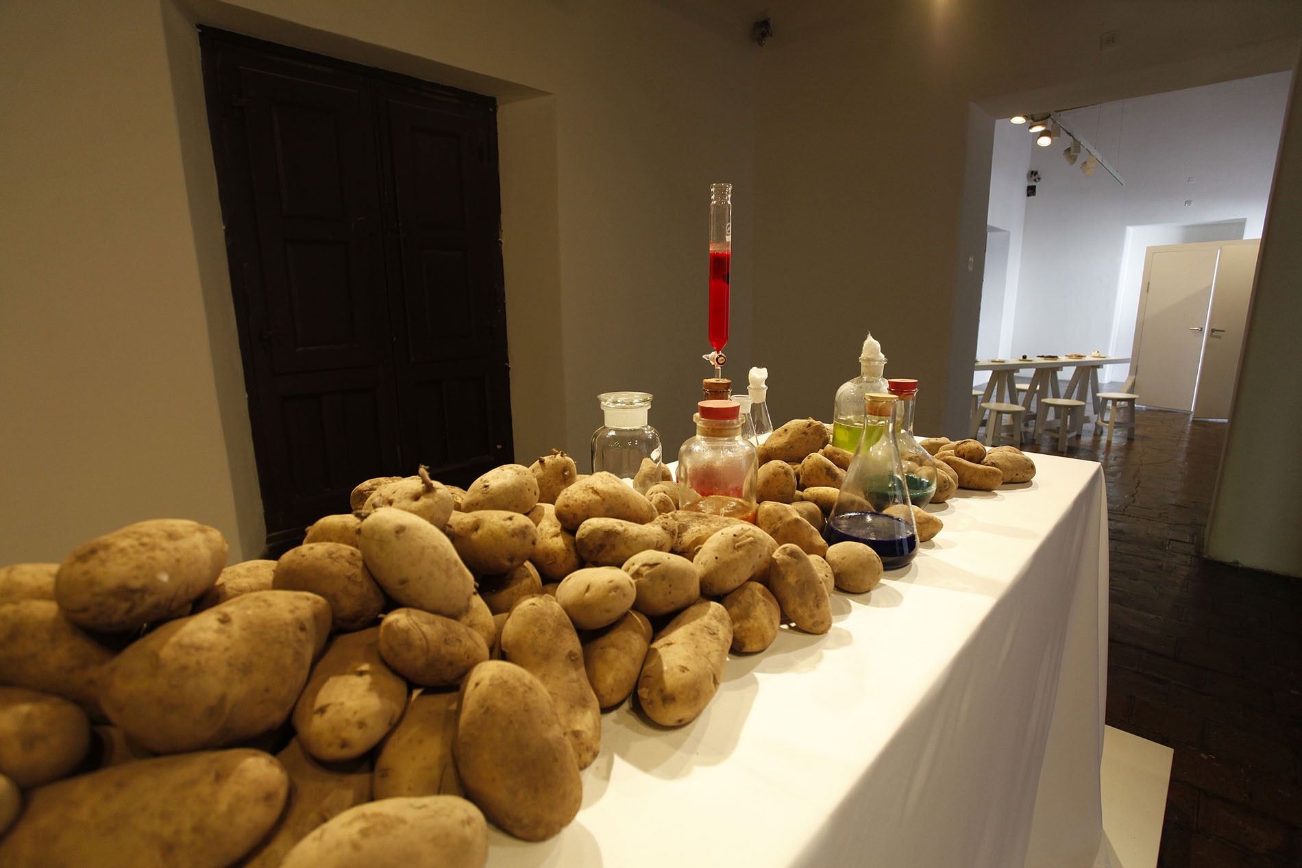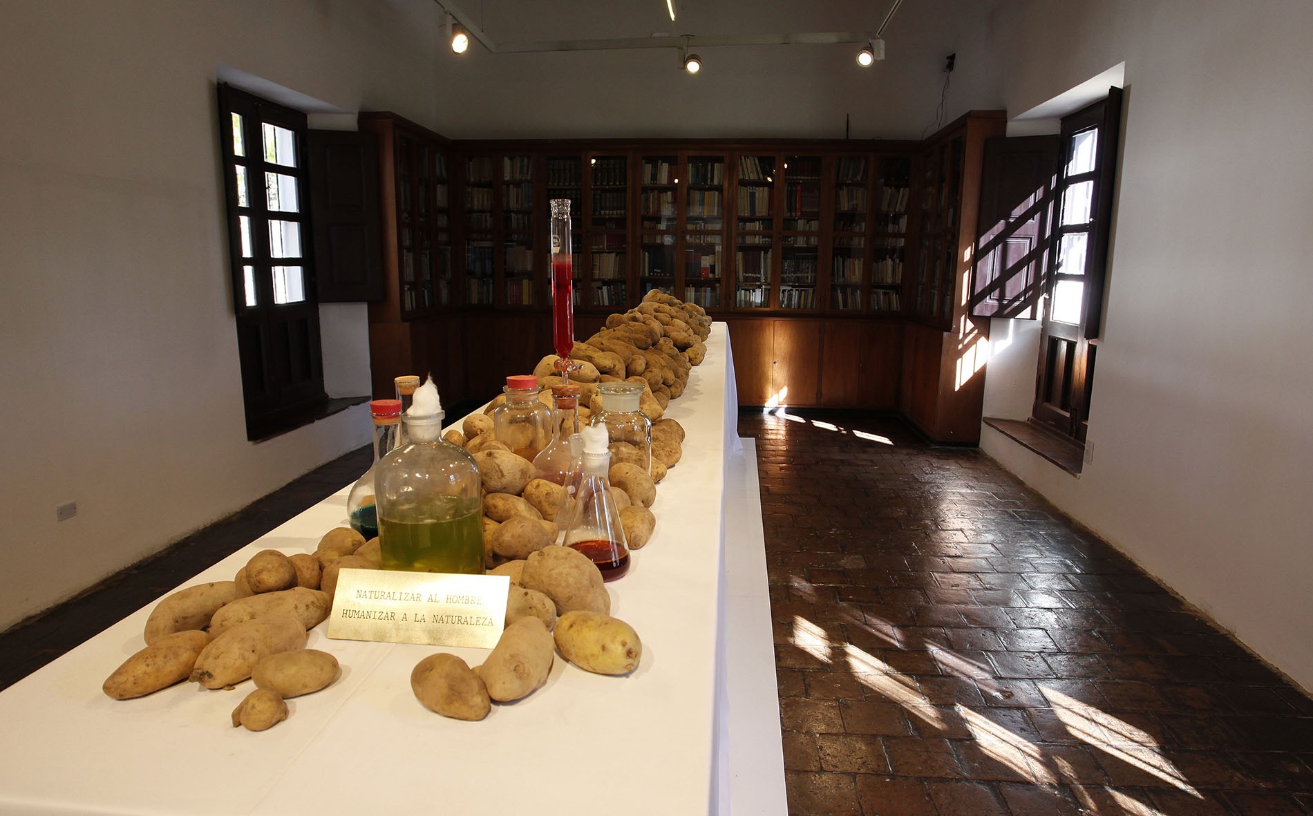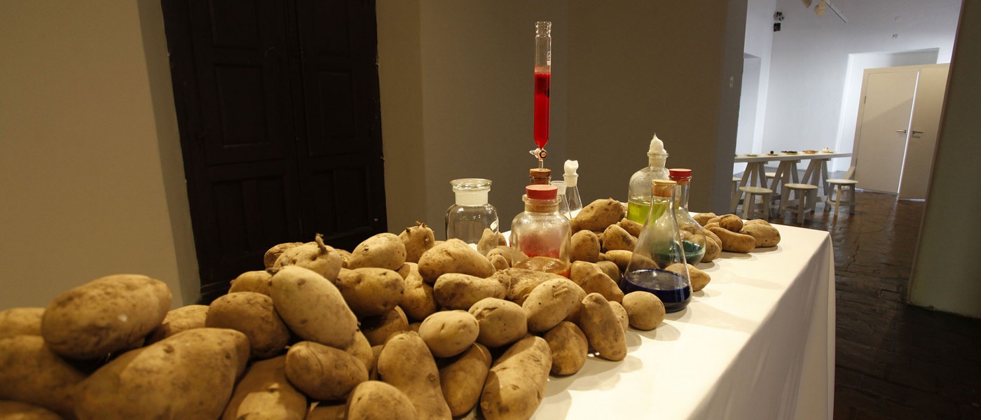 Fotografía: Naturalizar al hombre, humanizar a la naturaleza - Energía vegetal (detalle) 1977. Patatas, frascos de vidrio, soluciones de tinta, placa de bronce y mantel de lino sobre tablero de madera pintada y caballetes de dimensiones variables. Instalación: Transformación 28 de junio - 19 de octubre de 2014. Museo Universitario de Arte Contemporáneo (MUAC), Ciudad de México. Foto: Oliver Santana. Imagen cortesía de Alexander y Bonin, Nueva York.