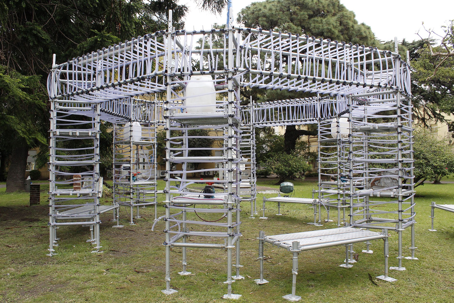 Laboratorio Anfibio del Plata (LAP) es una instalación espacial anfibia que recolecta, expone y problematiza la relación de la ciudad con sus cuerpos de agua. Arroyos entubados y una costanera negada evidencian la imposición del cemento sobre el agua del pantano. LAP propone, a través de la producción de artefactos y eventos, la construcción de un Archivo Anfibio que movilice y active pensamientos sobre cómo vivir y transformar nuestro territorio anfibio antropizado. El espacio circular de la estructura de andamios habilita a que los visitantes recorran el circuito hídrico que expone el flujo de agua invisibilizada. De esta manera, el visitante está permanentemente en contacto con el agua, sus imaginarios, los procesos de filtrado, así como también con objetos pertenecientes a la imaginación anfibia intervenidos por el grupo de artistas. El circuito hídrico recibe el agua extraída de los cuerpos cercanos a los sitios donde se ubica el LAP: el arroyo Medrano en Tecnópolis y el Río de la Plata en MUNTREF.