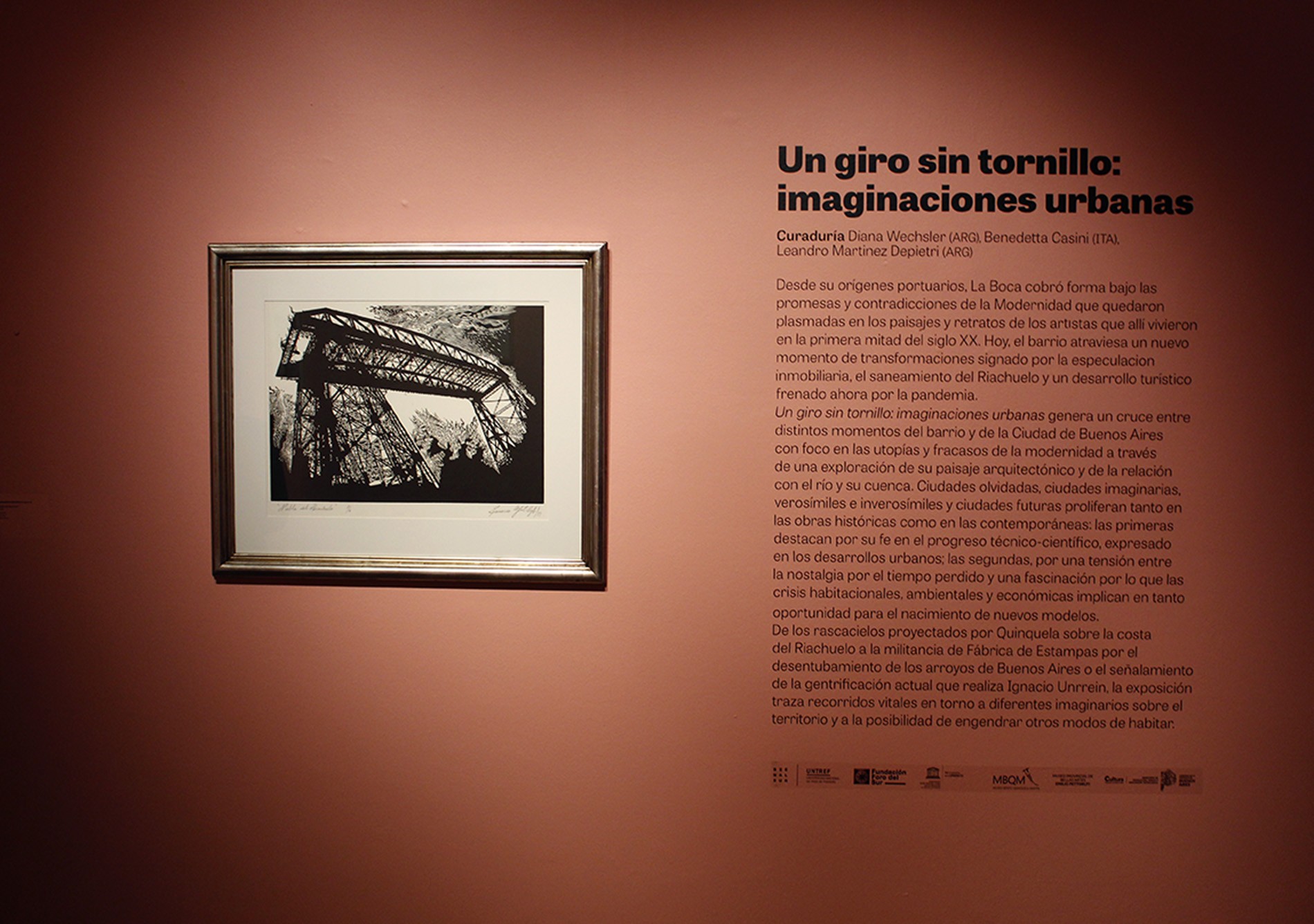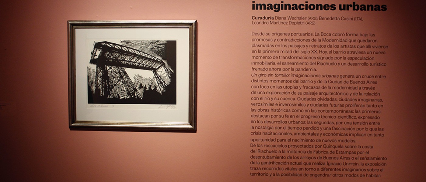 Visitas: viernes de 10 a 18h; sábados y domingos de 11.30 a 18h La exposición Un giro sin tornillo: imaginaciones urbanas surge del diálogo entre el acervo del Museo Benito Quinquela Martín y obras de artistas contemporáneos recibidas a través de la convocatoria abierta de BIENALSUR. La exposición sitúa la cuestión de los “modos de habitar” en la zona de La Boca poniendo en relación obras que reproducen utopías y fracasos de la modernidad. La promesa del desarrollo tecnológico es encarnada por la serie de grabados de Quinquela Martín: una locomotora, una hélice, una grampa, un engranaje y una grúa se elevan sobre un hervidero de pequeños cuerpos sin identidad al servicio de estas insignias del progreso. Las consecuencias de esta pulsión desarrollista sobre el medioambiente y los modos de vivir de la ciudad representan el foco de interés para los artistas invitados. Ciudades imaginarias proliferan como alternativas posibles, tanto en las obras históricas como en las contemporáneas. Dos elementos claves en la zona de La Boca, la problemática habitacional y la contaminación del Riachuelo, funcionan como disparadores para reflexiones más amplias que, operando entre lo local y lo global, resuenan en el territorio. Benedetta Casini