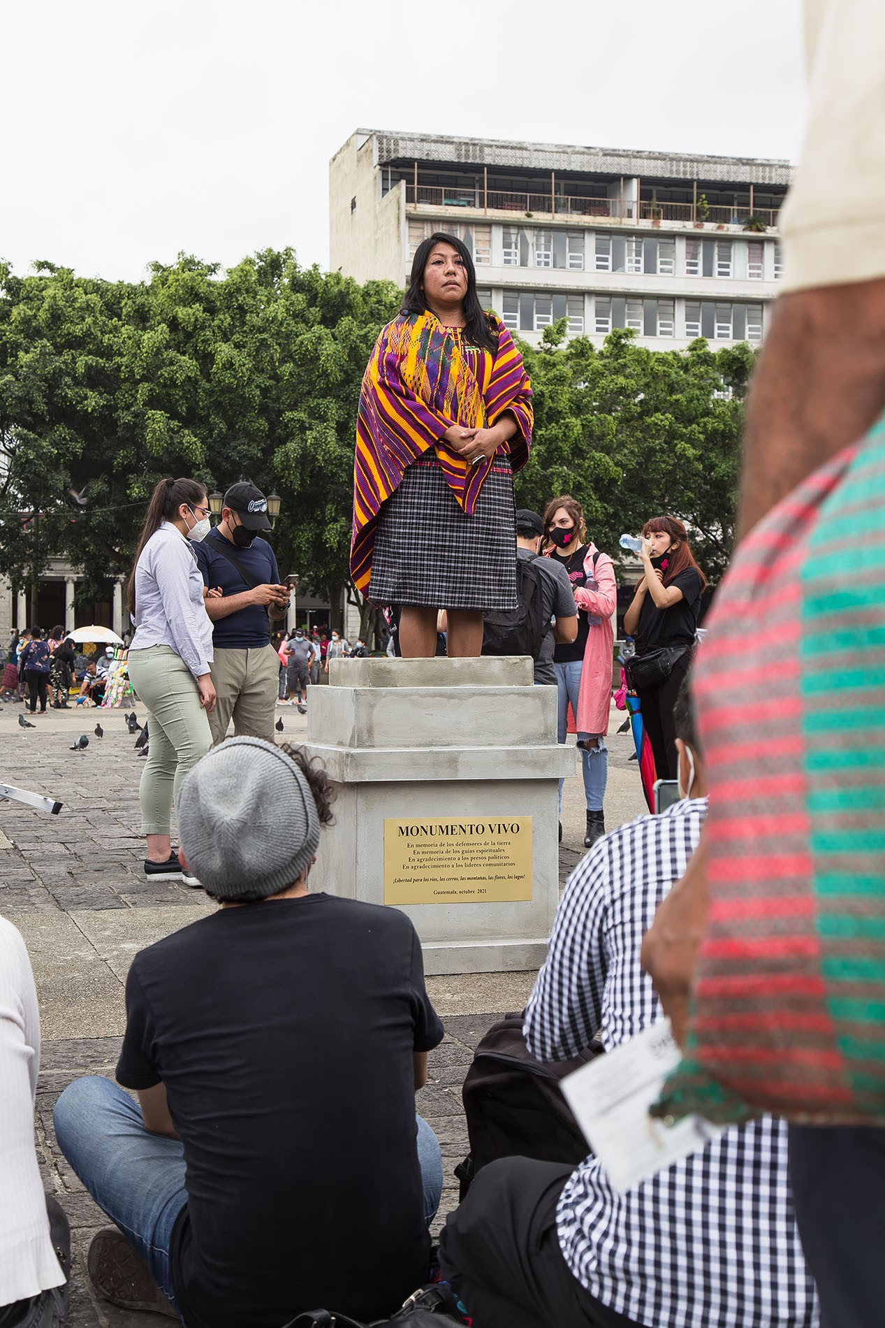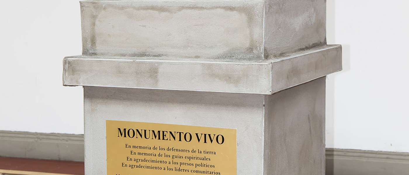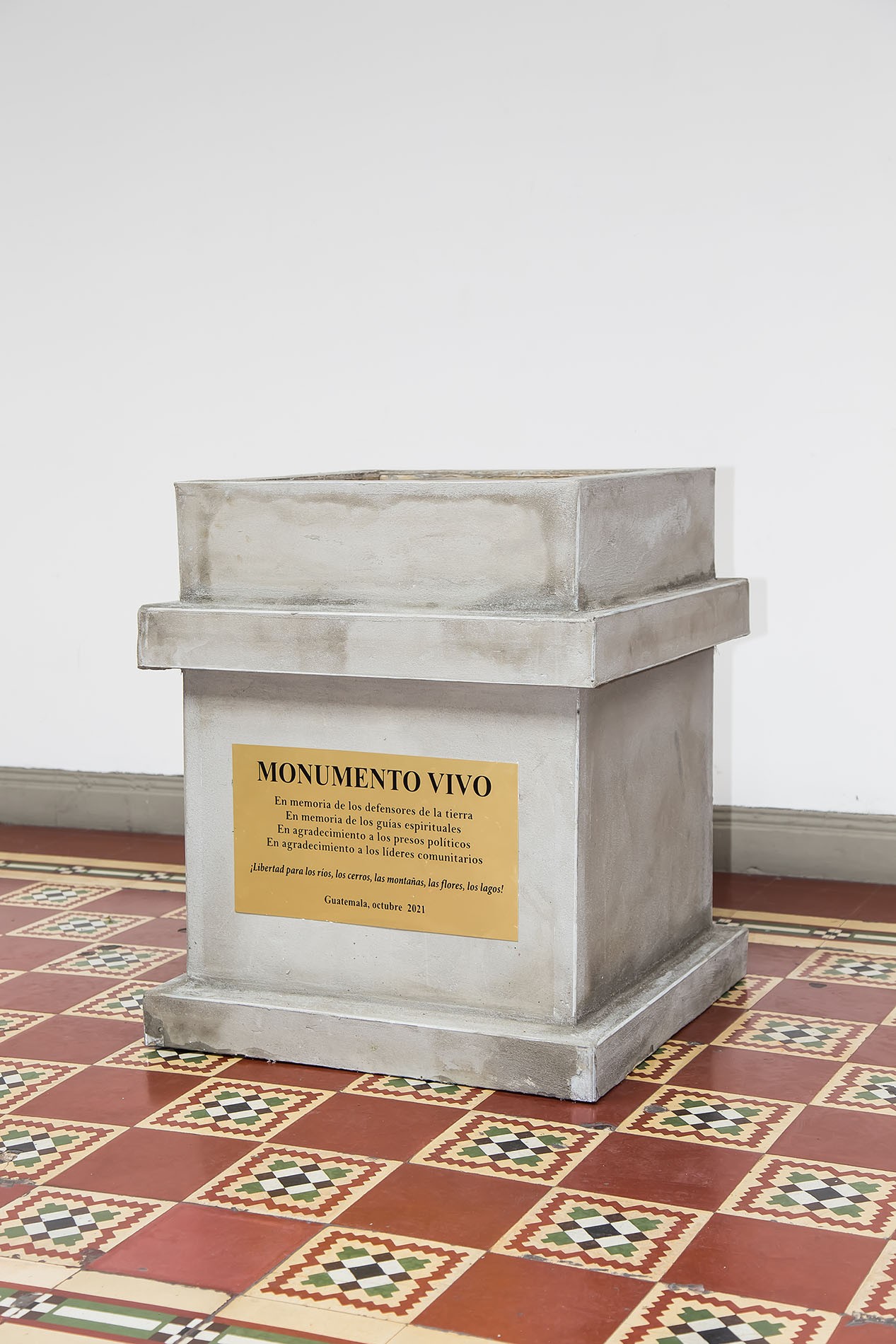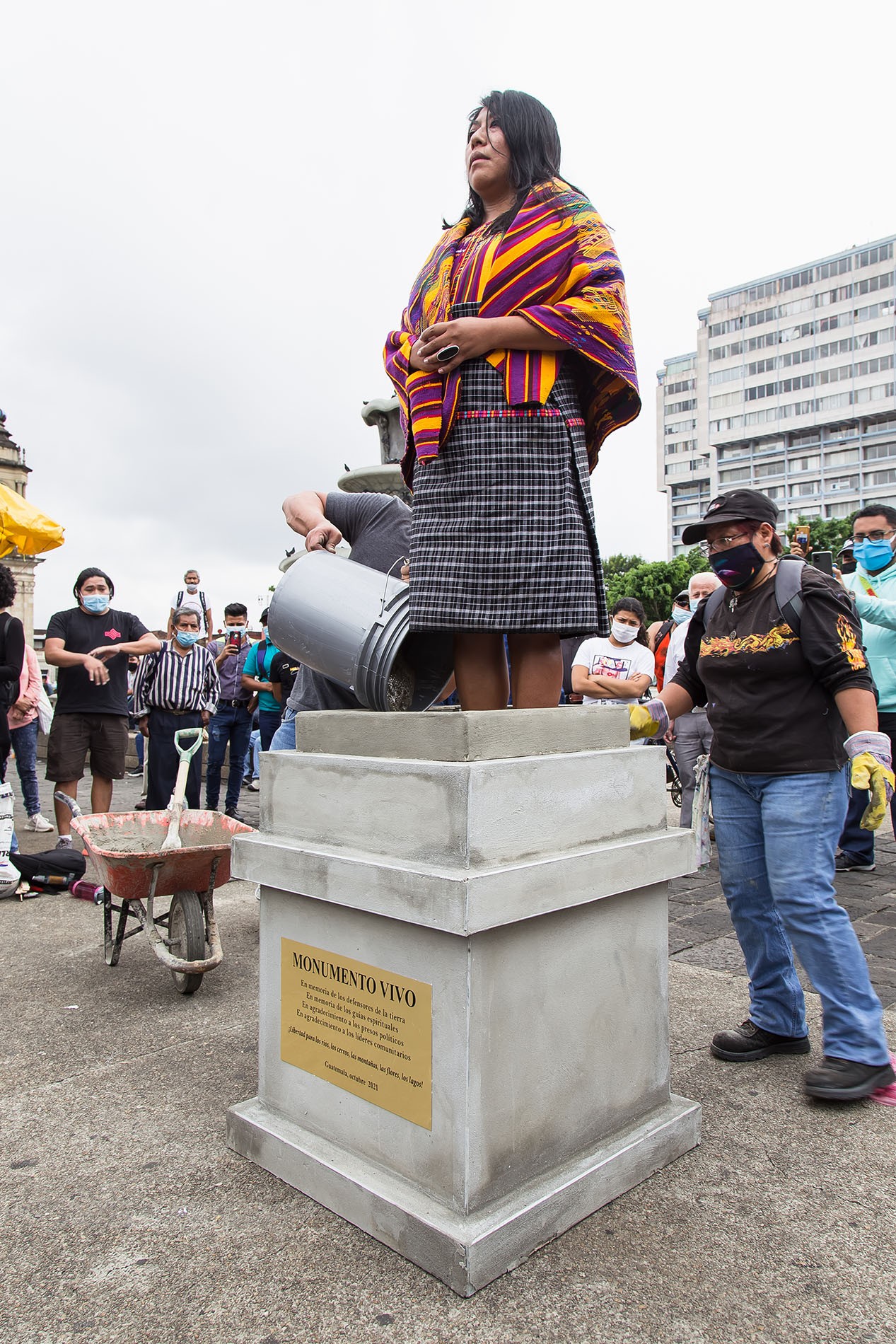 Monumento Vivo es un monumento del cuerpo de Marilyn Boror Bor, artista, mujer, indígena maya-kaqchiquel. Vestida con la indumentaria maya de San Juan Sacatepéquez en la Plaza Central de la Ciudad de Guatemala, el Monumento se asienta en una base de cemento que va fundiéndose con cemento líquido como un pedestal. El cemento cubre sus tobillos y va secándose durante el día, volviéndola un monumento vivo. Como todo monumento, la inscripción de su placa refiere al motivo de la conmemoración y en esta se lee: “En memoria de los defensores de la tierra, En memoria de los guías espirituales, En agradecimiento a los presos políticos, En agradecimiento a los líderes comunitarios. ¡Libertad para los ríos, los cerros, las montañas, las flores, los lagos!” El monumento es entonces un homenaje a la resistencia de los pueblos originarios y un recordatorio, en el marco del bicentenario de Guatemala, que en vez de celebrar, los pueblos están listos para contar sus contrahistorias de resistencia. La acción es también una denuncia a una situación particular en San Juan Sacatepéquez, lugar de origen de la artista. San Juan Sacatepéquez es conocido también como la Tierra de las Flores, sin embargo, recientemente las acciones de la Cementera San Gabriel, propiedad de Cementos Progreso y la oligarquía guatemalteca, han desabastecido de agua a la comunidad, siendo la falta del vital fluido, a causa el extractivismo, una de las mayores problemáticas que atenta la vida y el paisaje del lugar. Por ello, el uso del cemento en la acción tiene un significado político y simbólico, comentando sobre la relación que tiene este material con la historia del pueblo de San Juan. El paisaje se hunde en el cemento, la tierra originaria se cubre con falsas ideas de progreso y “civilización”, las huellas, la memoria y la vida se sotierran en polvo. El cemento cubre sus pies y los aprisiona, mientras la artista resiste a su presión haciendo memoria y homenaje a los defensores de la tierra. Somos el monumento vivo que está en lucha del territorio, caminamos sobre el cemento fresco que la oligarquía y el poder pone en nuestros pies, dejamos las huellas y no dejamos que este endurezca a su paso.