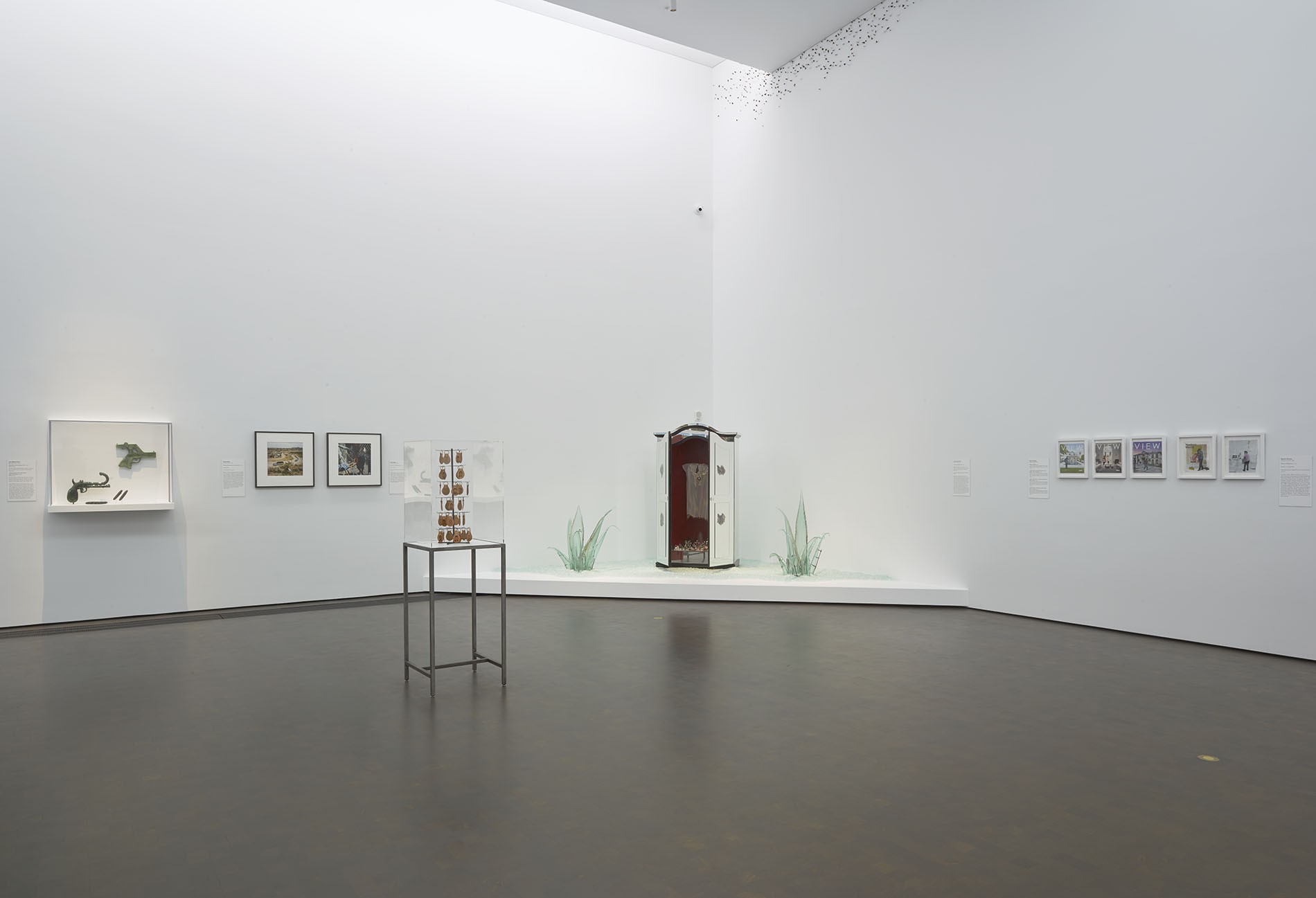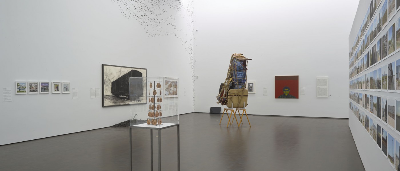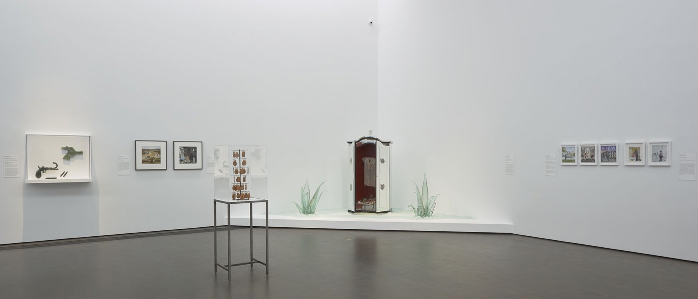 Frontera La frontera entre Estados Unidos y México se extiende a lo largo de 1,954 millas (3,145 km). Es la frontera más transitada del mundo con 350 millones de cruces legales al año y, a lo largo de su historia de delimitaciones cartográficas, ha sido un lugar conflictivo en las relaciones Norte-Sur. Los artistas expuestos en esta sala presentan la zona como un límite político, cultural y psicológico flexible cargado de violencia. Desarrollan estrategias innovadoras para cuestionar determinados aspectos de la experiencia del límite, entre ellas: el registro de la frontera como límite geográfico y físico del paisaje; el homenaje a aquellos cuyo viaje de ilusiones a través de la frontera terminó trágicamente, así como la perspectiva examinada de sobrevivientes que se topan con una vida diferente a la esperada; el examen de la experiencia de aquellos que se encuentran atrapados en la red legal de la detención y la deportación; el reconocimiento del trabajo que aportan los inmigrantes a la sociedad estadounidense, aunque permanezcan en la invisibilidad, como también la denuncia de la violencia endémica que impregna todo, subrayando el tráfico de drogas y humano hacia y desde Estados Unidos. Estas obras aportan miradas poderosas a la complejidad de la dinámica entre agentes y víctimas de “la frontera”.