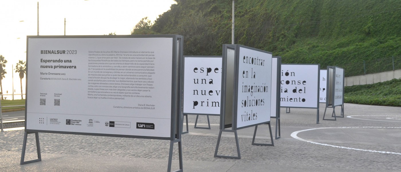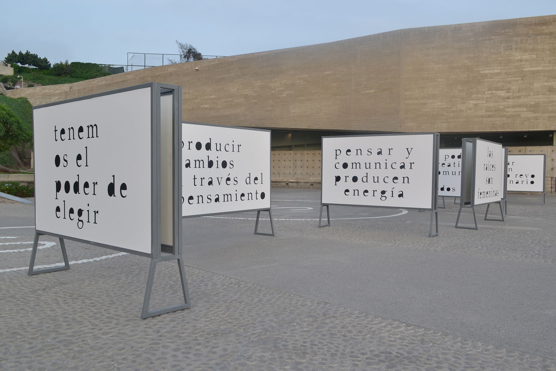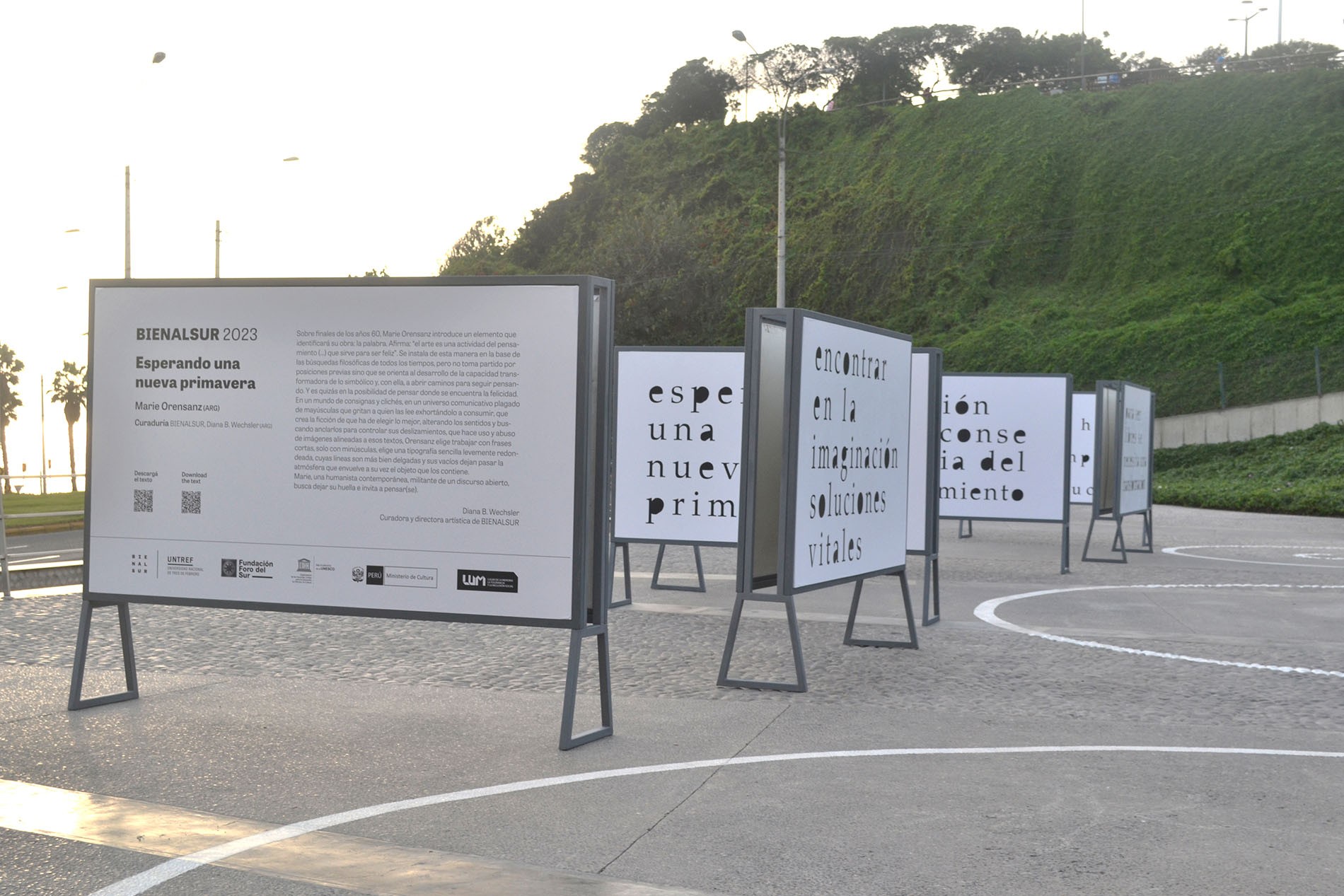 Inauguración: Miércoles 6 de septiembre 17h Sobre finales de los años 60, Marie Orensanz introduce un elemento que identificará su obra: la palabra. Afirma: “el arte es una actividad del pensamiento (…) que sirve para ser feliz”. Se instala de esta manera en la base de las búsquedas filosóficas de todos los tiempos, pero no toma partido por posiciones previas sino que se orienta al desarrollo de la capacidad transformadora de lo simbólico y, con ella, a abrir caminos para seguir pensando. Y es quizás en la posibilidad de pensar donde se encuentra la felicidad. En un mundo de consignas y clichés, en un universo comunicativo plagado de mayúsculas que gritan a quien las lee exhortándolo a consumir, que crea la ficción de que ha de elegir lo mejor, alterando los sentidos y buscando anclarlos para controlar sus deslizamientos, que hace uso y abuso de imágenes alineadas a esos textos, Orensanz elige trabajar con frases cortas, solo con minúsculas, elige una tipografía sencilla levemente redondeada, cuyas líneas son más bien delgadas y sus vacíos dejan pasar la atmósfera que envuelve a su vez el objeto que los contiene.