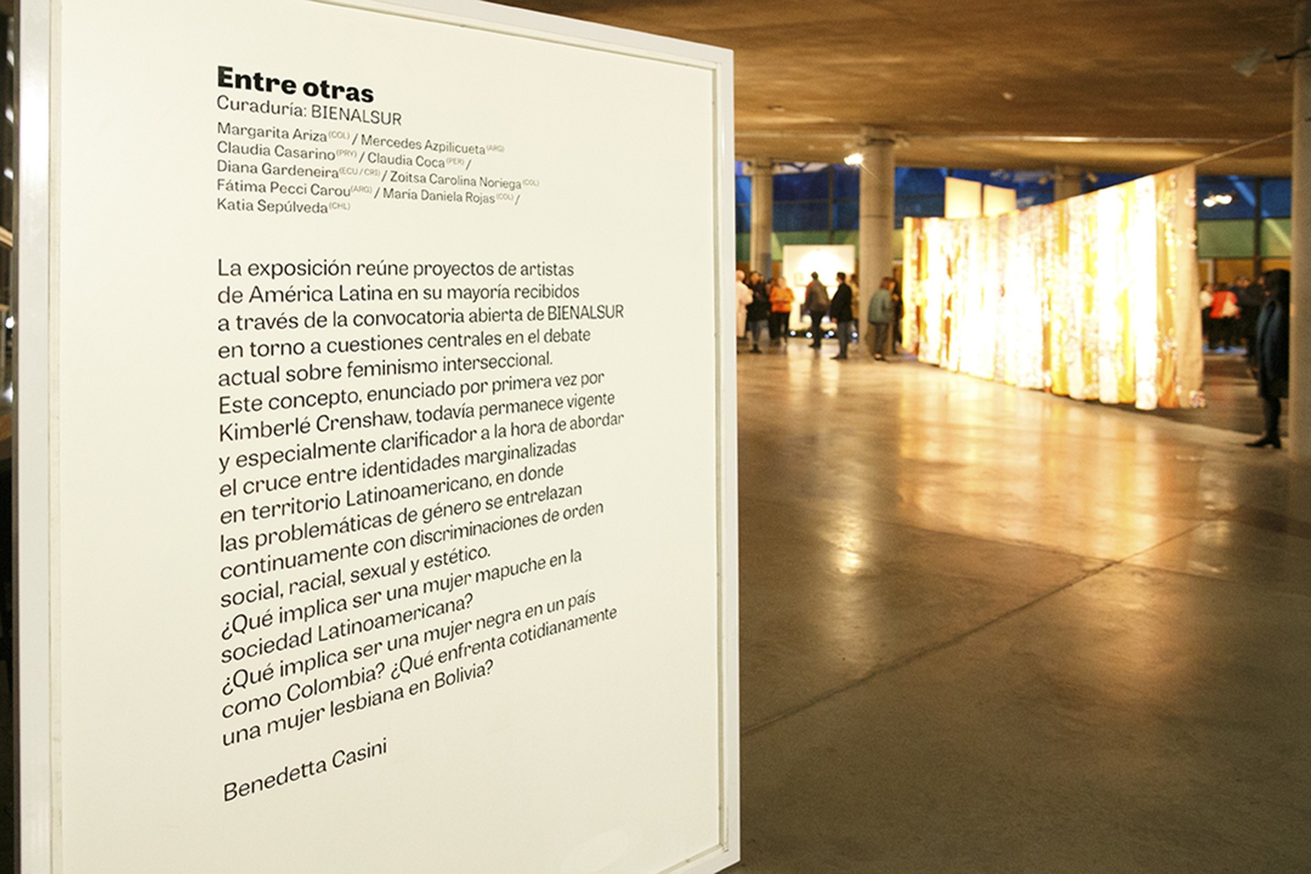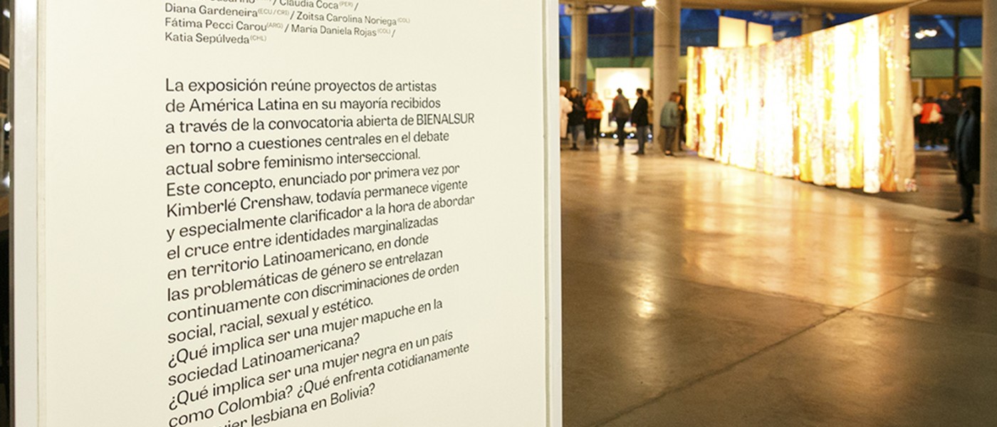Esta exposición reúne proyectos de artistas de América Latina –en su mayoría recibidos a través de la convocatoria abierta de BIENALSUR– en torno a cuestiones centrales en el debate actual sobre feminismo interseccional. El concepto, enunciado por primera vez por Kimberlé Crenshaw, todavía permanece vigente y resulta especialmente clarificador a la hora de abordar el cruce entre identidades marginalizadas en el territorio Latinoamericano, en donde las problemáticas de género se entrelazan continuamente con discriminaciones de orden social, racial, sexual y estético. ¿Qué implica ser una mujer mapuche en la sociedad Latinoamericana? ¿Qué implica ser una mujer negra en un país como Colombia? ¿Qué enfrenta cotidianamente una mujer lesbiana en Bolivia?